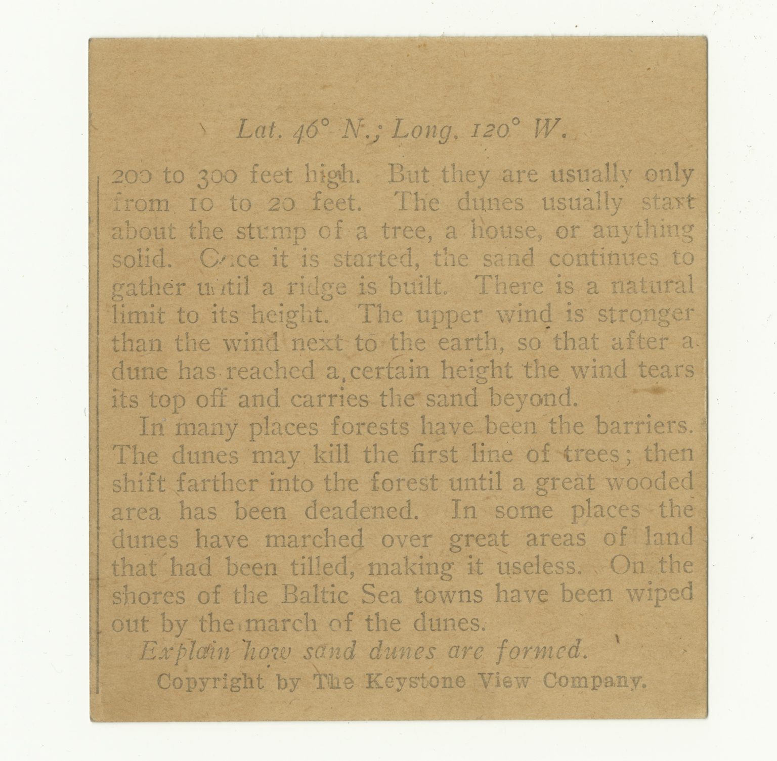 200 to 300 feet high. But they are usually only from 10 to 20 feet. The dunes usually start about the stump of a tree, a house, or anything solid. Once it is started, the sand continues to gather until a ridge is built. There is a natural limit to its height. The upper wind is stronger than the wind next to the earth, so that after a dune has reached a certain height the wind tears its top off and carries the sand beyond. In many places forests have been the barriers. The dunes may kill the first line of trees; then shift farther into the forest until a great wooded area has been deadened. In some places the dunes have marched over great areas of land that had been tilled, making it useless. One the shores of the Baltic Sea towns have been wiped out by the march of the dunes. Explain how sand dunes are formed.