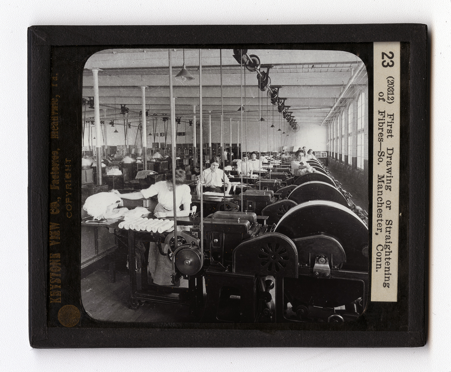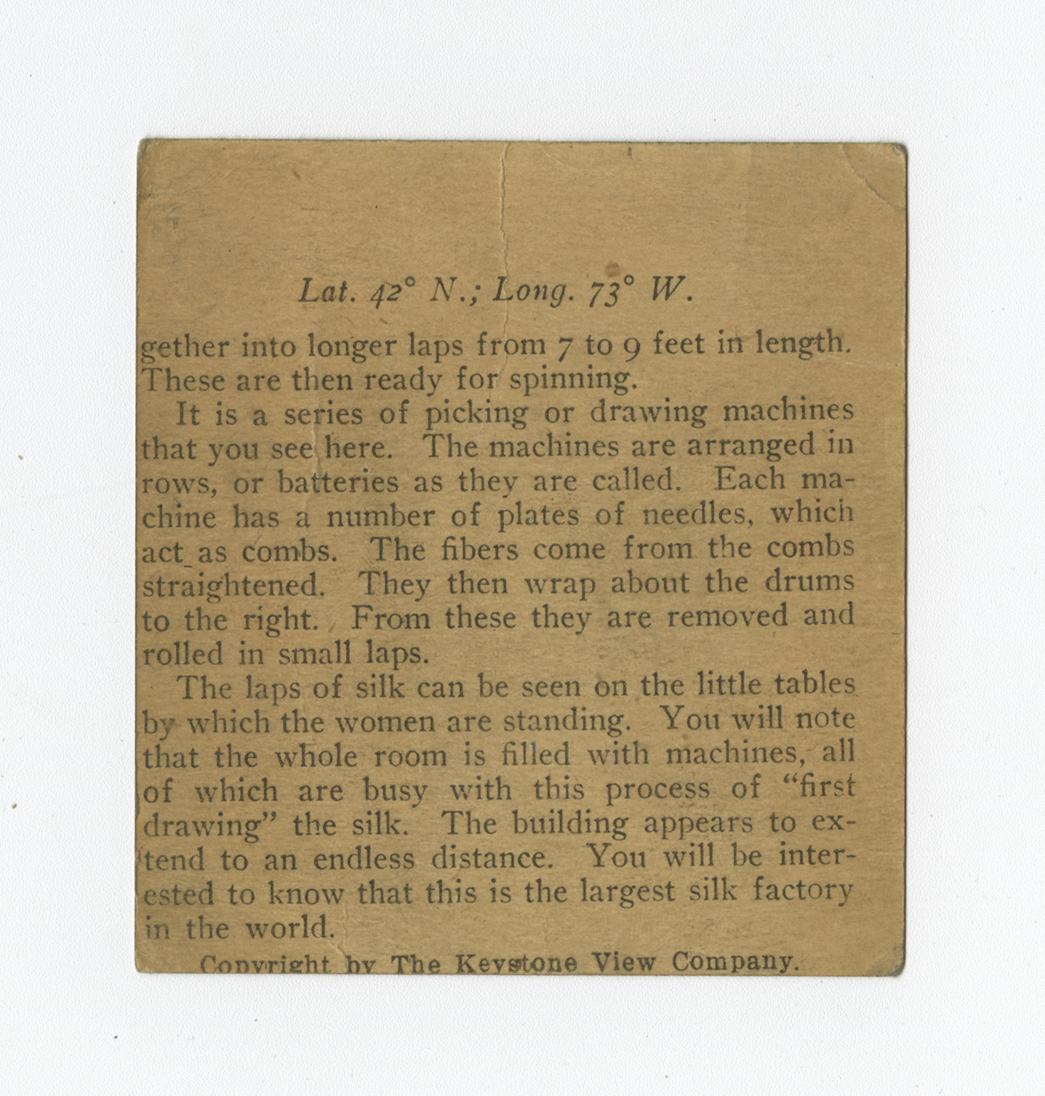 gether into longer laps from 7 to 9 feet in length. These are then ready for spinning. It is a series of picking or drawing machines that you see here. The machines are arranged in rows, or batteries as they are called. Each machine has a number of plates of needles, which act as combs. The fibers come from the combs straightened. They then wrap about the drums to the right. From these they are removed and rolled in small laps. The laps of silk can be seen on the little tables by which the women are standing. You will note that the whole room is filled with machines, all of which are busy with this process of "first drawing" the silk. The building appears to extend to an endless distance. You will be interested to know that this is the largest silk factory in the world.