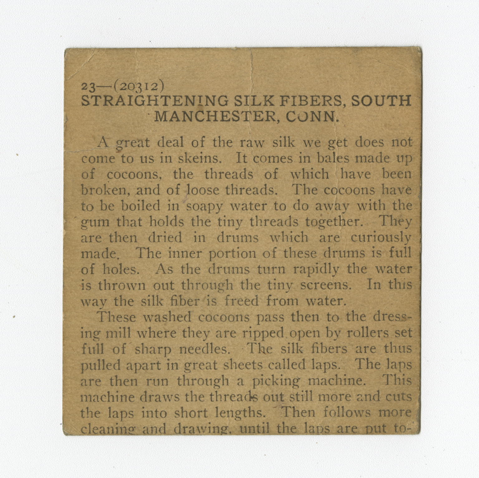 A great deal of the raw silk we get does not come to us in skeins. It comes in bales made up of cocoons, the threads of which have been broken, and of loose threads. The cocoons have to be boiled in soapy water to do away with the gum that holds the tiny threads together. They are then dried in drums which are curiously made. The inner portion of these drums is full of holes. As the drums turn rapidly the water is thrown out through the tiny screens. In this way the silk fiber is freed from water. These washed cocoons pass then to the dressing mill where they are ripped open by rollers set full of sharp needles. The silk fibers are thus pulled apart in great sheets called laps. The laps are then run through a picking machine. This machine draws the threads out still more and cuts the laps into short lengths. Then follows more cleaning and drawing, until the laps are put to-