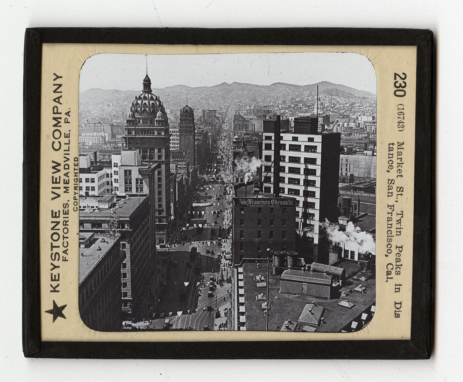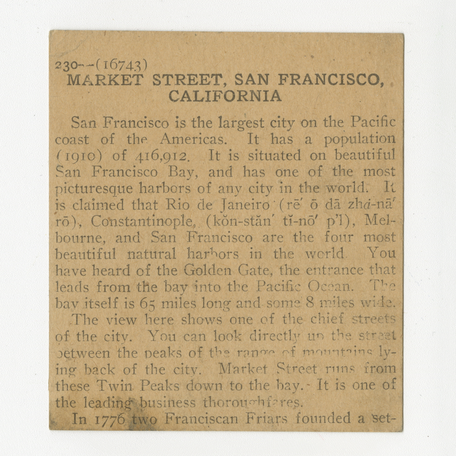 San Francisco is the largest city on the Pacific coast of the Americas. It has a population (1910) of 426,912. It is situated on beautiful San Francisco Bay, and has one of the most picturesque harbors of any city in the world. It is claimed that Rio de Janeiro, Constantinople, Melbourne, and San Francisco are the four most beautiful natural harbors in the world. You have heard of the Golden Gate, the entrance that leads from the bay into the Pacific Ocean. The bay itself is 65 miles long and some 8 miles wide. The view here shows one of the chief streets of the city. You can look directly up the streets of the city. You can look directly up the street between the peaks of the range of mountains lying back of the city. Market Street runs from these Twin Peaks down to the bay. It is one of the leading business thoroughfares. In 1776 two Franciscan Friars founded a set-
