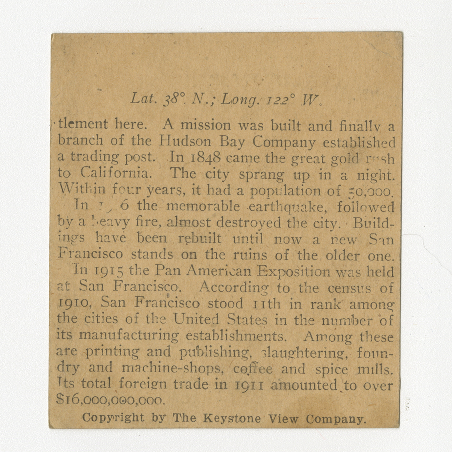 tlement here. A mission was built and finally a branch of the Hudson Bay Company established a trading post. In 1848 came the great gold rush to California. The city sprang up in a night. Within four years, it had a population of 50,000. In 1906 the memorable earthquake, followed by a heavy fire, almost destroyed the city. Buildings have been rebuilt until now a new San Francisco stands on the ruins of the older one. In 1915 the Pan American Exposition was held at San Francisco stood 11th in rank among the cities of the United States in the number of its manufacturing establishments. Among these are printing and publishing, slaughtering, foundry and machine-shops, coffee and spice mills. Its total foreign trade in 1911 amounted to over $16,000,000,000.