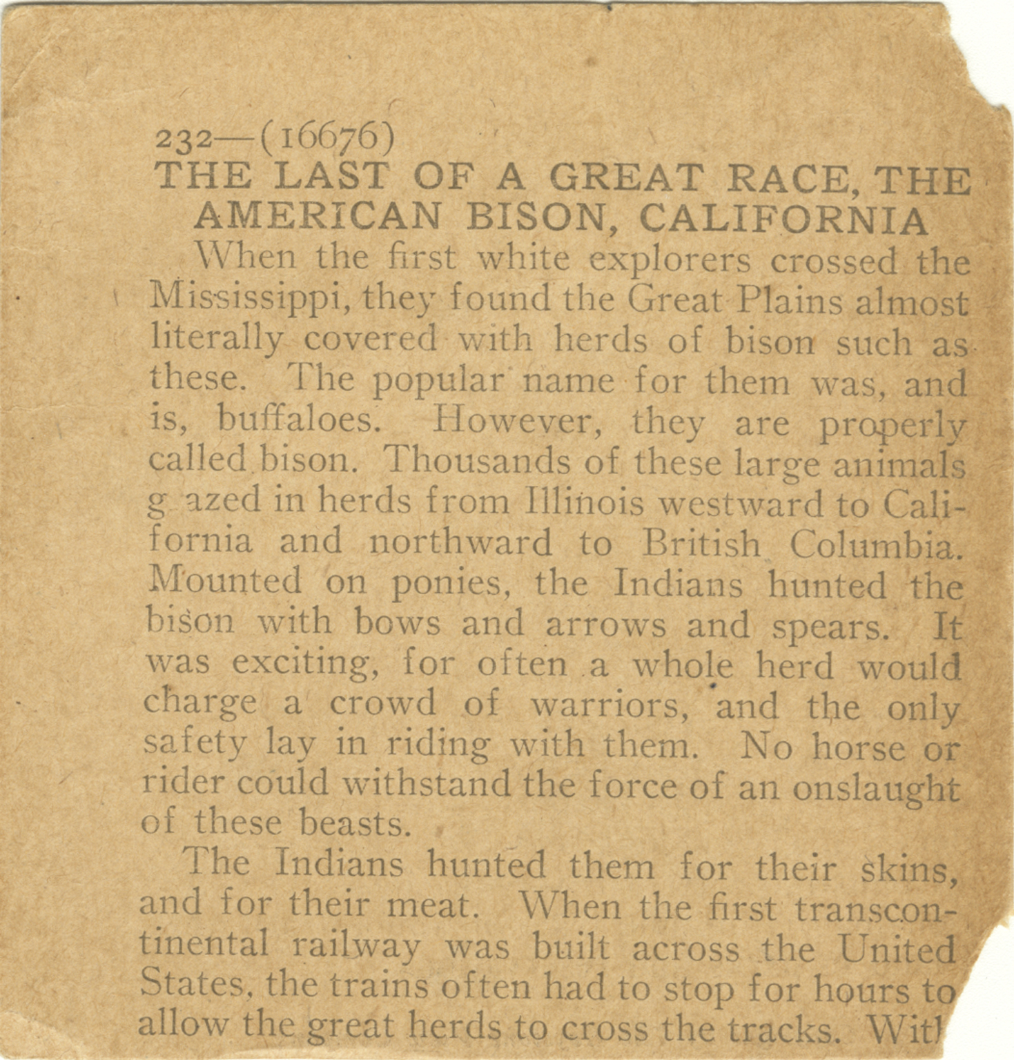 When the first white explorers crossed the Mississippi, they found the Great Plains almost literally covered with herds of bison such as these. The popular name fro them was, and is, buffaloes. However, they are properly called bison. Thousands of these large animals glazed in herds from Illinois westward to California and northward to British Columbia. Mounted on ponies, the Indians hunted the bison with bows and arrows and spears. It was exciting, for often a while herd would charge a crowd of warriors, and the only safety lay in riding with them. No horse or rider could withstand the force of an onslaught of these beasts. The Indians hunted them for their skins, and for their meat. When the first transcontinental railway was built across the United States, the trains often had to stop for hours to slow the great herds to cross the tracks. With