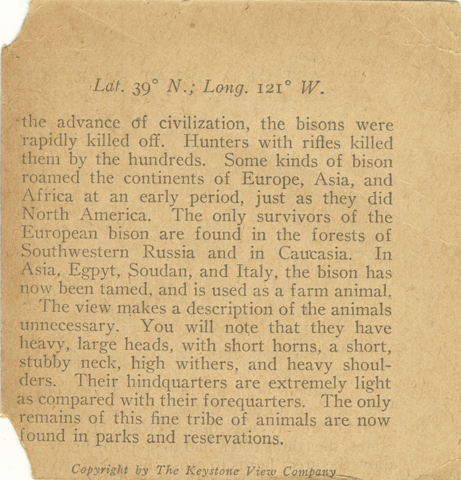the advance of civilization, the bisons were rapidly killed off. Hunters with rifles killed them by the hundreds. Some kinds of bison roamed the continents of Europe, Asia, and Africa at an early period, just as they did North America. The only survivors of the European bison are found in the forests of Southwestern Russia and in Caucasia. In Asia, Egypt, Soudan, and Italy, the bison has now been tamed, and is used as a farm animal. The view makes a description of the animals unnecessary. You will note that they have heavy, large heads, with short horns, a short, stubby neck, high withers, and heavy shoulders. Their hindquarters are extremely light as compared with their forequarters. The only remains of this fine tribe of animals are now found in parks and reservations.