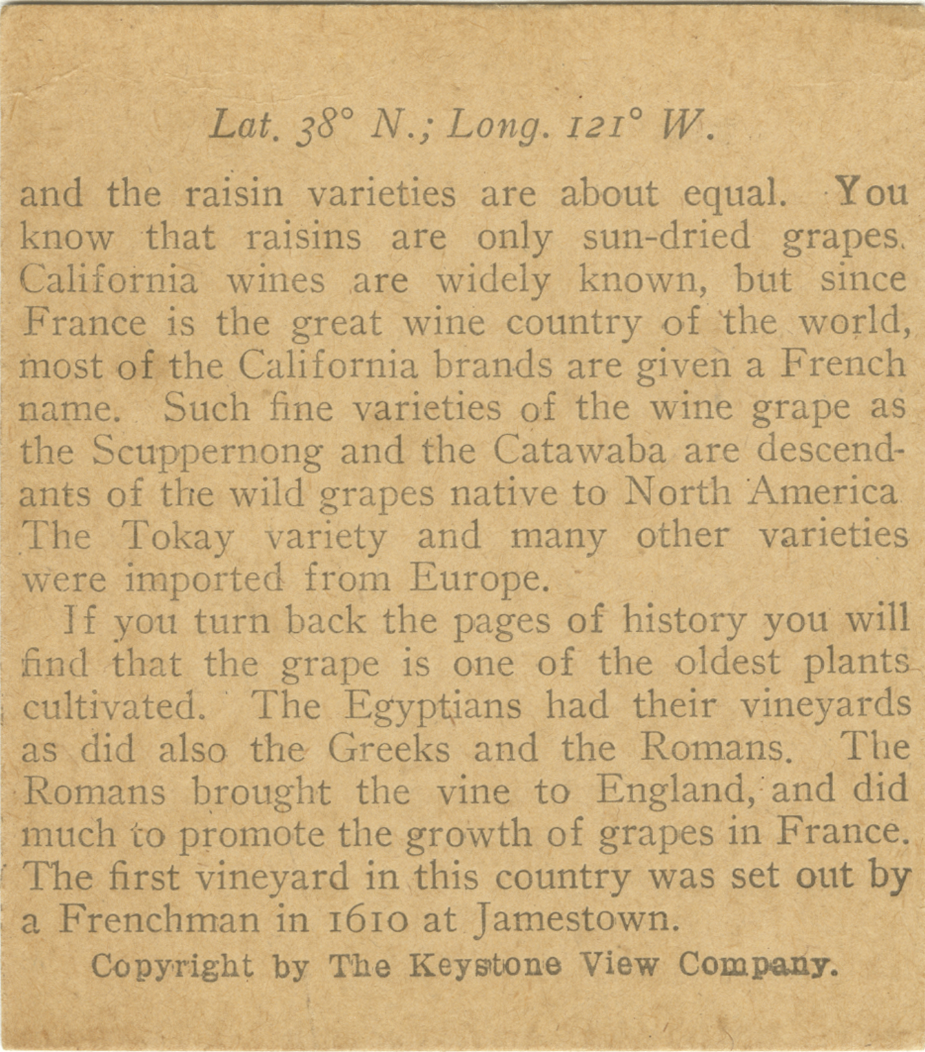 and the raisin varieties are about equal. You know that raisins are only sun-dried grapes. California wines are widely known, but since France is the great wine country of the world, most of the California brands are given a French name. Such fine varieties of the wine grape as the Scuppernong and the Catawaba are descendants of the wild grapes native to North America. The Tokay variety and many other varieties were imported from Europe. If you turn back the pages of history you will find that the grape is one of the oldest plants cultivated. The Egyptians had their vineyards as did also the Greeks and the Romans. The Romans brought the vine to England, and did much to promote the growth of grapes in France. The first vineyard in this country was set out by a Frenchman in 1610 at Jamestown.