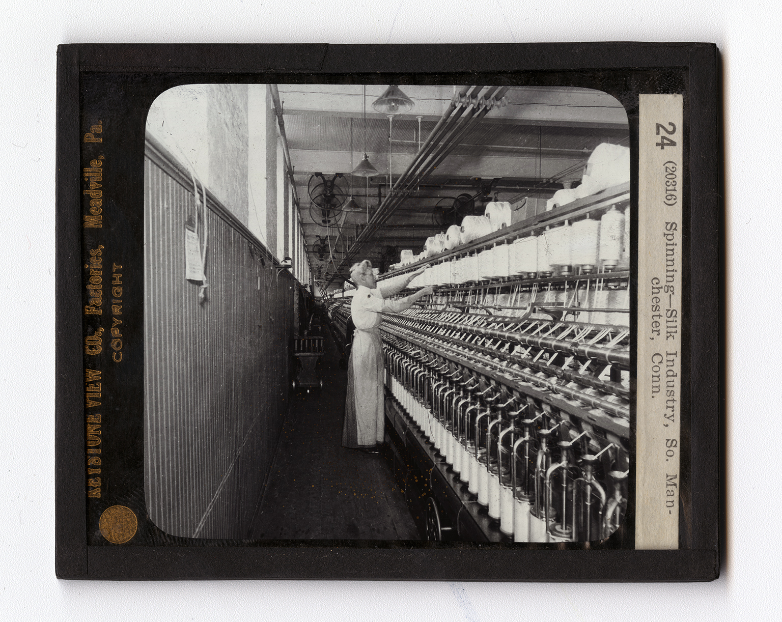 which makes the threads the same size. They are then reeled into skeins, inspected, and sent to the warehouse. Here they may be dyed or sent to the mill to be woven into plain silk goods. It should be remembered that the silk so spun is quite different from reeled silk. In the reeled silk, the "singles" go to what is called the throwing mills where it is twisted, doubled, and twisted again so that the right sized thread is formed. These threads are reeled into skeins and then put upon bobbins. In the big mills here shown there are almost 40,000 spindles used in "throwing", winding, and spooling the silk. The extent of the silk industry is measured by the number of spindles in the factories. The census of 1910 shows that there were 2,400,000 spindles in the United States. This number has probably been increased to 3,000,000.