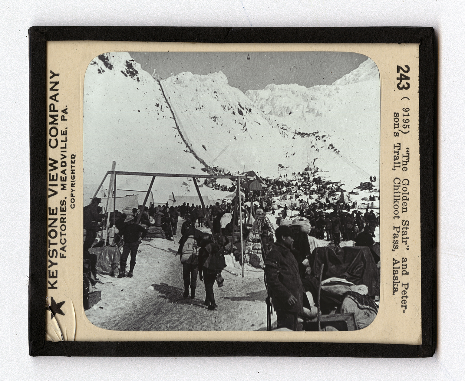 tains in the background answer your question. This is the famous Peterson's Trail over the Chilkoot Pass in Alaska. The ships that brought the miners landed at Juneau or at Skagway. To reach the gold fields to the north and northwest, the range of mountains had to be climbed. The easiest trail was through the Chilkoot Pass. But it was, as you see, a steep one, hard to climb, and especially difficult in the winter time. The miners piled their belongings at the foot of the mountain, and waited for dog sledges to take them over the pass. Small fortunes were spent to secure teams, because each man was in a hurry to get to the gold fields. Most of them packed their bundles on their backs and struggled bravely over the steep pass. You will observe that each miner is keeping a sharp eye on his belongings for a very good reason.