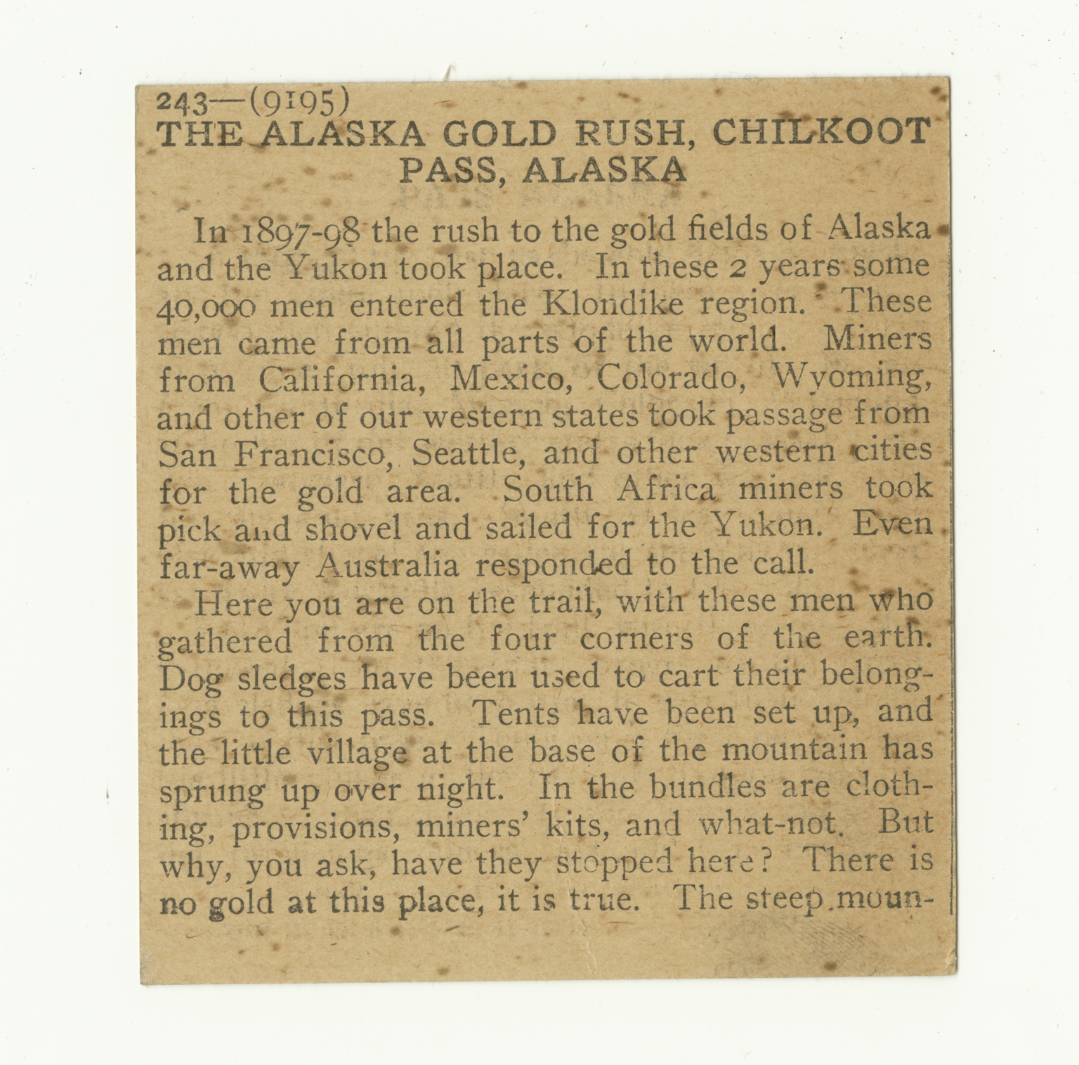 In 1897-98 the rush to the gold fields of Alaska and the Yukon took place. In these 2 years some 40,000 men entered the Klondike region. These men came from all parts of the world. Miners from California, Mexico, Colorado, Wyoming, and other of our western states took passage from San Francisco, Seattle, and other western cities for the gold area. South Africa miners took pick and shovel and sailed for the Yukon. Even far-away Australia responded to the call. Here you are on the trail, with these men who gathered from the four corners of the earth. Dog sledges have been used to cart their belongings to this pass. Tents have been set up, and the little village at the base of the mountain has sprung up over night. In the bundles are clothing, provisions, miners' kits, and what-not. But why, you ask, have they stopped here? There is no gold at this place, it is true. The steep moun-