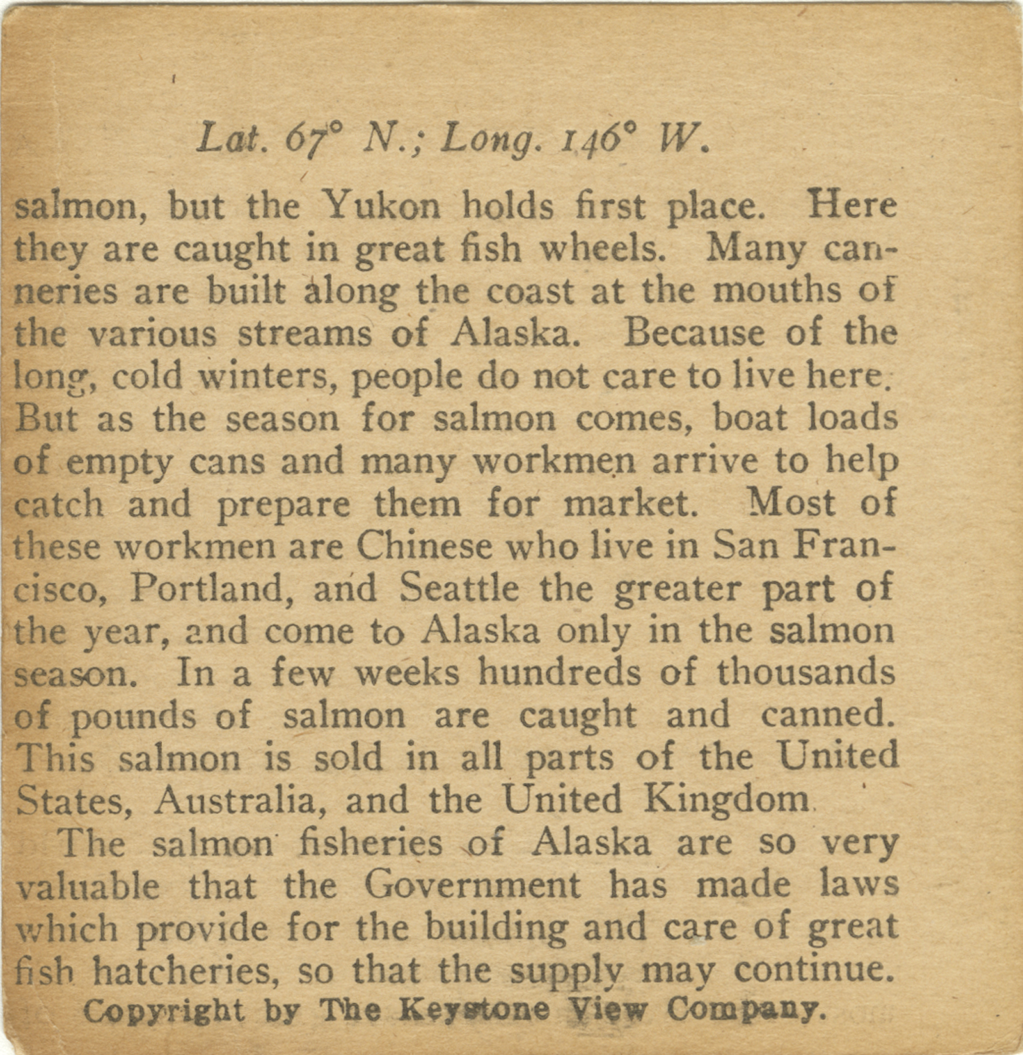 salmon, but the Yukon holds first place. Here they are caught in great fish wheels. Many canneries are built along the coast at the mouths of the various streams of Alaska. Because of the long, cold winters, people do not care to live here. But as the season for salmon comes, boat loads of empty cans and many workmen arrive to help catch and prepare them for market. Most of these workmen are Chinese who live in San Francisco, Portland, and Seattle the greater part of the year, and come to Alaska only in the salmon season. In a few weeks hundreds of thousands of pounds of salmon are caught and canned. This salmon is sold in all parts of the United States, Australia, and the United Kingdom. The salmon fisheries of Alaska are so very valuable that the Government has made laws which provide for the building and care of great fish hatcheries, so that the supply may continue.