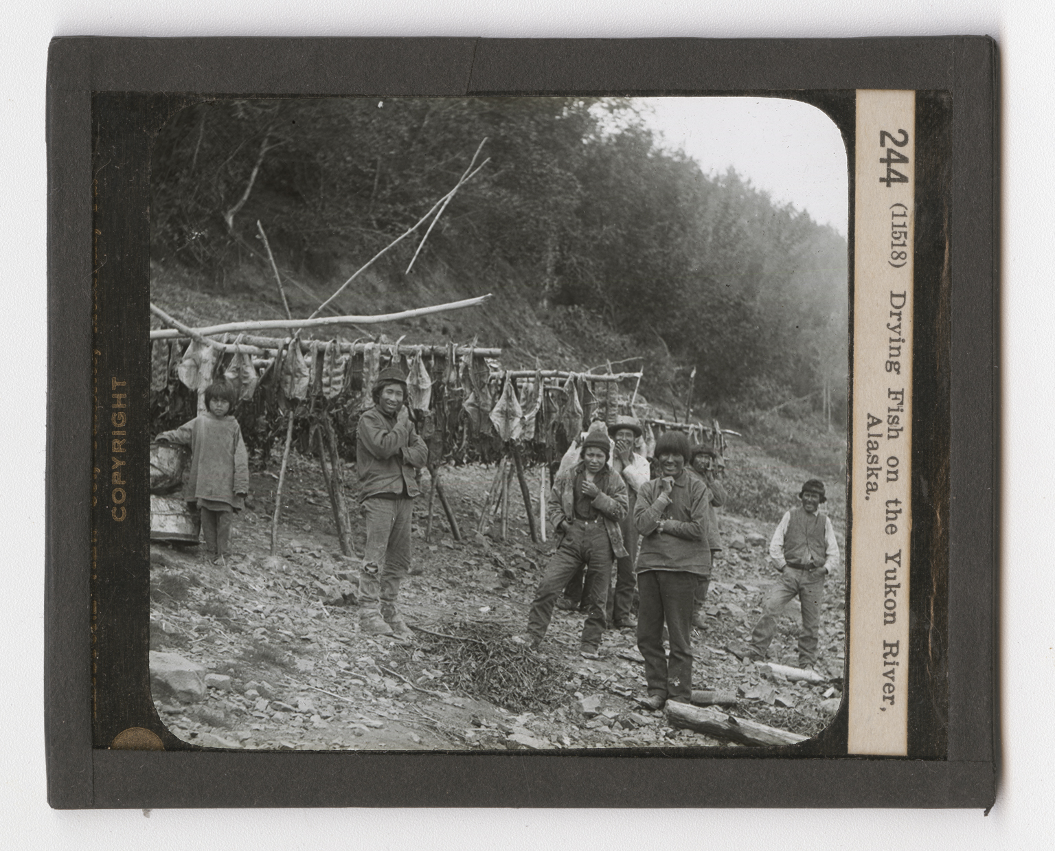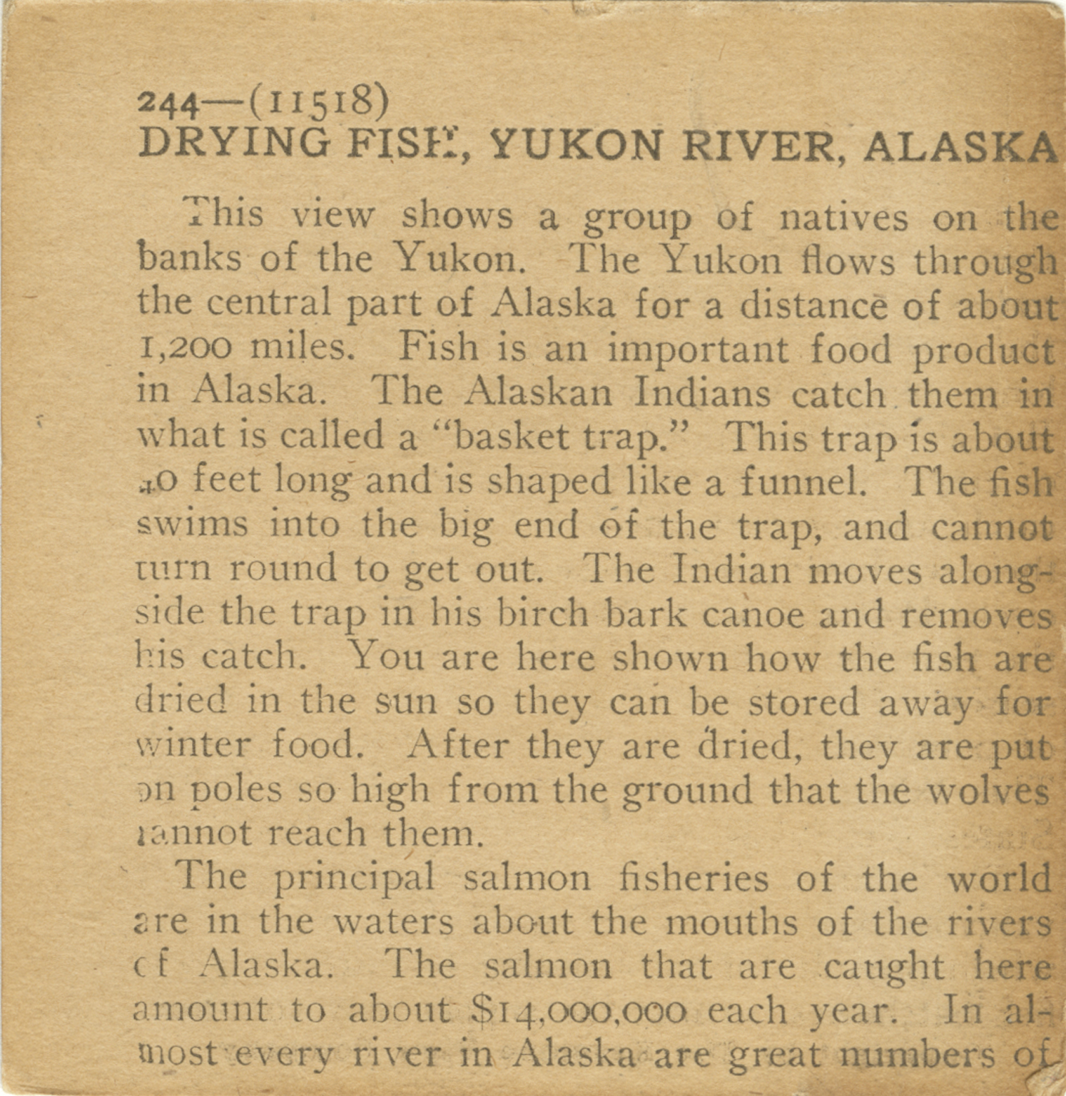 This view shows a group of natives on the banks of the Yukon. The Yukon flows through the central part of Alaska for a distance of about 1,200 miles. Fish is an important food product in Alaska. The Alaskan Indians catch them in what is called a "basket trap." This trap is about 10 feet long and is shaped like a funnel. The fish swims into the big end of the trap, and cannot turn round to get out. The Indian moves alongside the trap in his birch bark canoe and removes his catch. You are here shown how the fish are dried in the sun so they can be stored away for winter food. After they are dried, they are put on poles so high from the ground that the wolves cannot reach them. The principal salmon fisheries of the world are in the waters about the mouths of the rivers of Alaska. The salmon that are caught here amount to about $14,000,000 each year. In almost every river in Alaska are great numbers of
