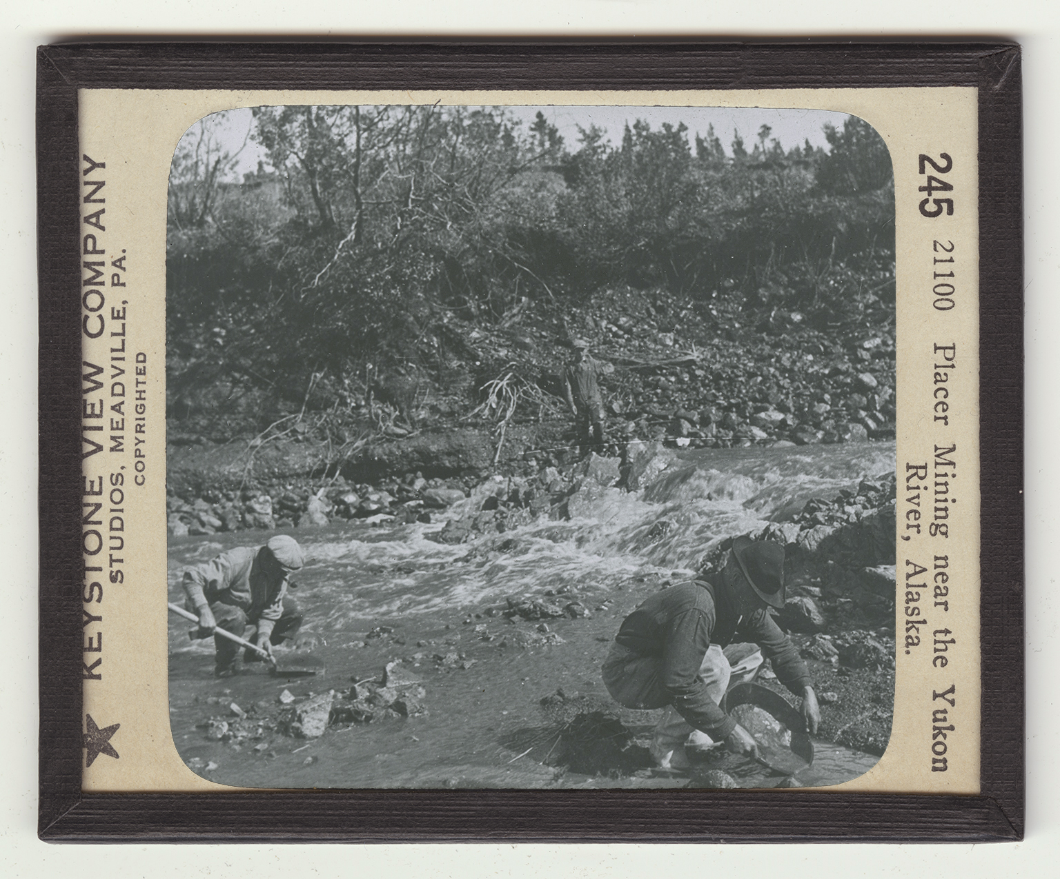 In 1896 word came from Alaska that great quantities of gold had been discovered there. In 1897 the great Alaska gold rush came. Miners from all parts of the world crowded vessels bound for our northern possession. Many of these miners were ill equipped. They had only a small amount of money, and a few supplies. The sufferings they endured during the winters in Alaska have never been fully told. A few of them made fortunes. Most of them lost the little they had, and were lucky to get out with their lives. Since that time, sections of the country have developed rapidly in agriculture, fishing, mining, and manufacturing. The miners you see here are mining by the simplest process. It is called placer mining, or panning. The business is simple. These miners have taken a claim on which they believe or hope there is "pay dirt". In the beds of streams, or