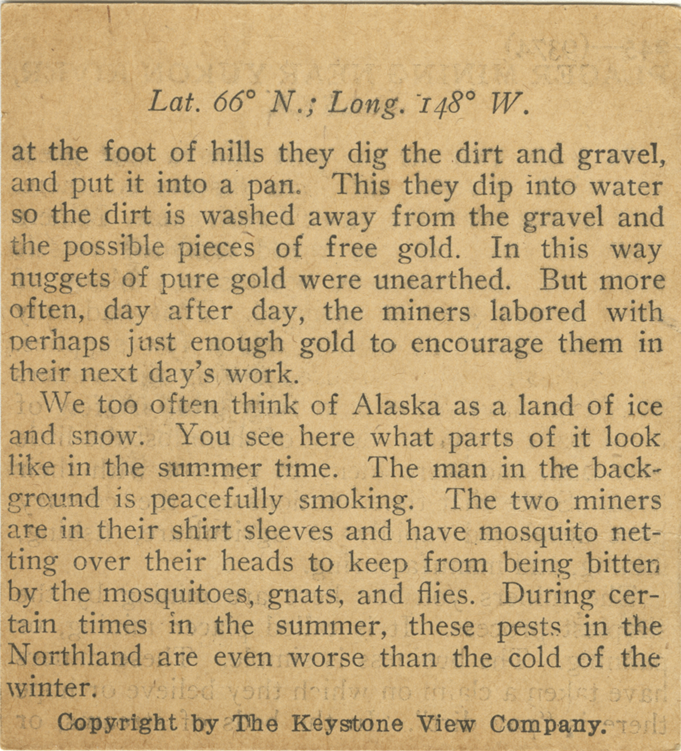 at the foot of hills they dig the dirt and gravel, and put into a pan. This they dip into water so the dirt is washed away from the gravel and the possible pieces of free gold. In this way nuggets of pure gold, the miners labored with perhaps just enough gold to encourage them in their next day's work. We too often think of Alaska as a land of ice and snow. You see here what parts of it look like in the summer time. The man in the background is peacefully smoking. The two miners are in their shirt sleeves and have mosquito netting over their heads to keep from being bitten by the mosquitos, gnats, and flies. During certain times in the summer, these pests in the Northland are even worse than the cold of the winter.