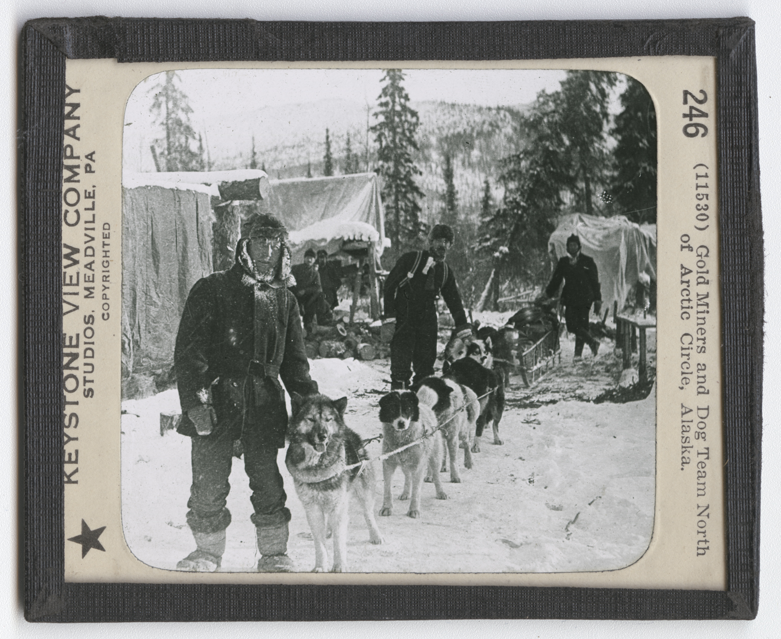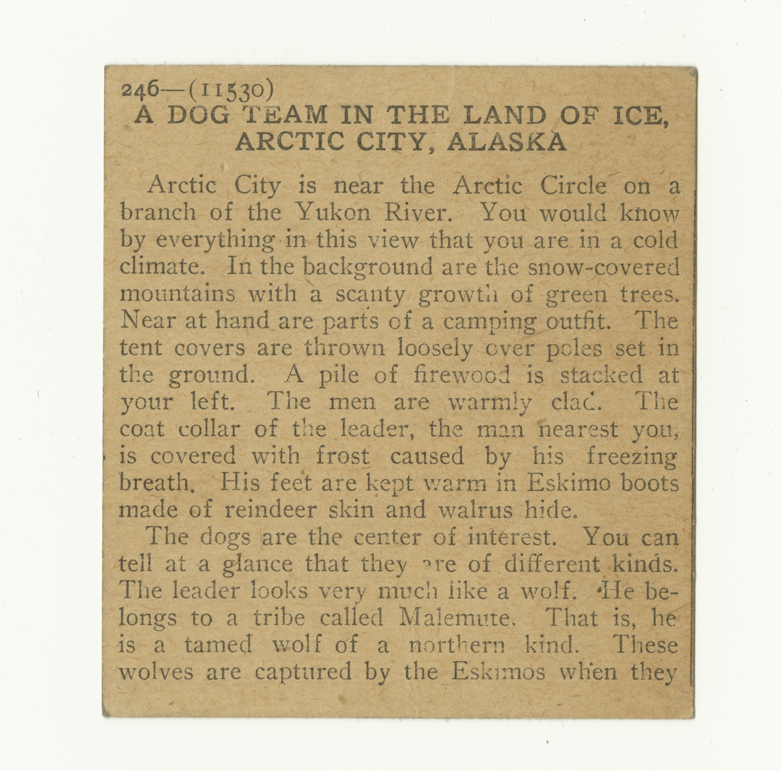 Arctic City is near the Arctic Circle on a branch of the Yukon River. You would know by everything in this view that you are in a cold climate. In the background are the snow-covered mountains with a scanty growth of green trees. Near at hand are parts of a camping outfit. The tent covers are thrown loosely over poles set in the ground. A pile of firewood is stacked at your left. The men are warmly clad. The coat collar of the leader, the man nearest you, is covered with frost caused by his freezing breath. His feet are kept warm in Eskimo boots made of reindeer skin and walrus hide. The dogs are the center of interest. You can tell at a glance that they are of different kinds. The leader looks very much like a wolf. He belongs to a tribe called malemute. That is, he is a tamed wolf of a northern kind. These wolves are captured by the Eskimos when they
