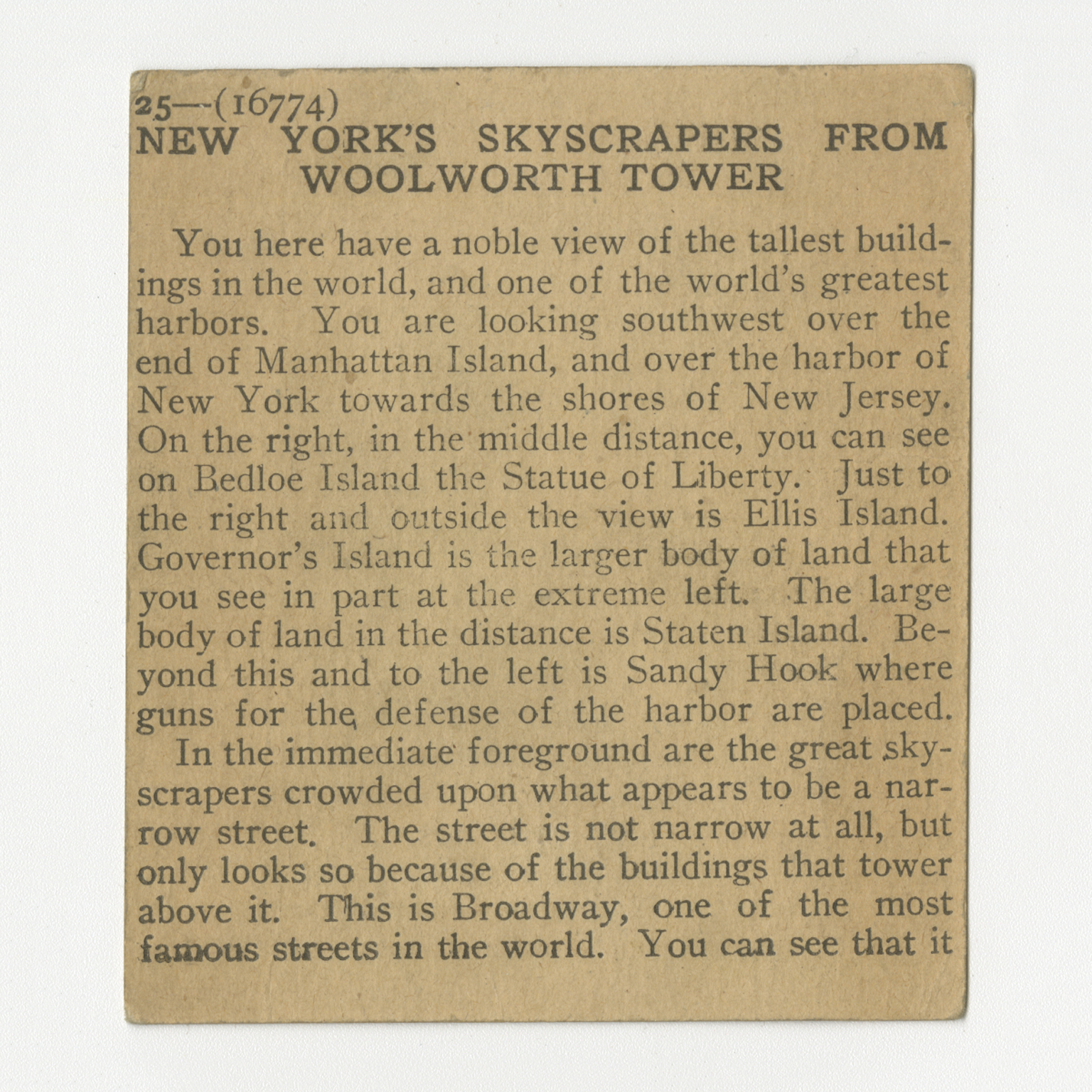You here have a noble view of the tallest building in the world, and one of the world's greatest harbors. You are looking southwest over the end of Manhattan Island, and over the harbor of New York towards the shores of New Jersey. On the right, in the middle distance, you can see on Bedloe Island the Statue of Liberty. Just to the right and outside the view is Ellis Island. Governor's Island is the larger body of land that you see in part at the extreme left. The large body of land in the distance is Staten Island. Beyond this and to the left is Sandy Hook where guns for the defense of the harbor are placed. In the immediate foreground are the great skyscrapers crowded upon what appears to be a narrow street. The street is not narrow at all, but only looks so because of the buildings that tower above it. This is Broadway, one of the most famous streets in the world. You can see that it