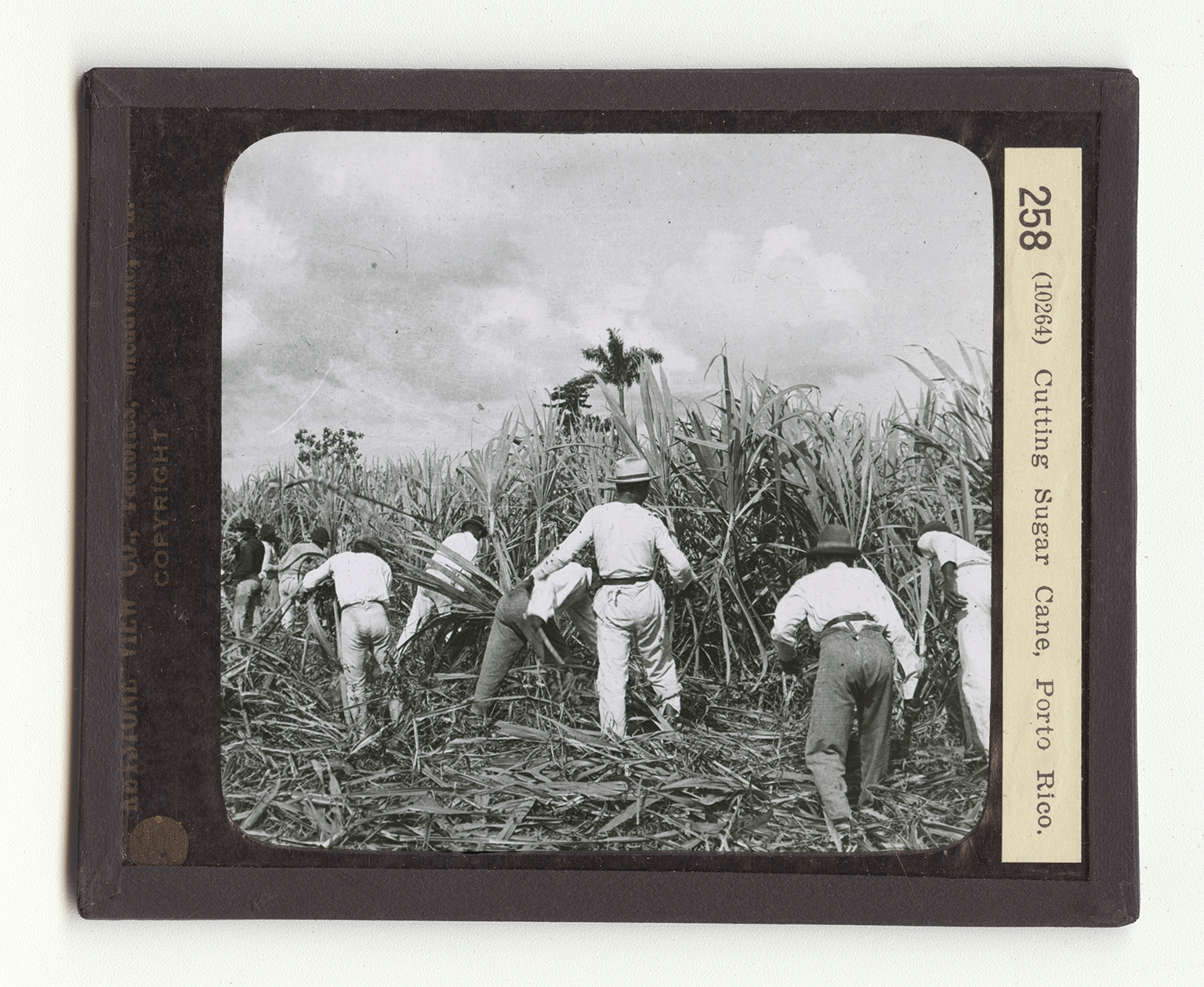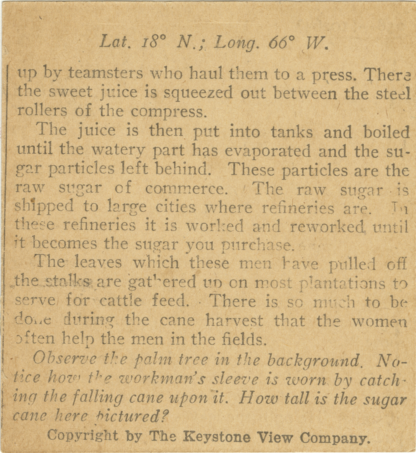 up by teamsters who haul them to a press. There the sweet juice is squeezed out between the steel rollers of the compress. The juice is then put inot tanks and boiled until the watery part has evaporated and the sugar particles left behind. These particles are the raw sugar of commerce. The raw sugar is shipped to large cities where refineries are. In these refineries it is worked and reworked until it becomes the sugar you purchase. The leaves which these men have pulled off the stalks are gathered up on most plantations to serve for cattle feed. There is so much to be done during the cane harvest that the women often help the men in the fields. Observe the palm tree in the background. Notice how the workman's sleeve is worn by catching the falling cane upon it. How tall is the sugar cane here pictured?