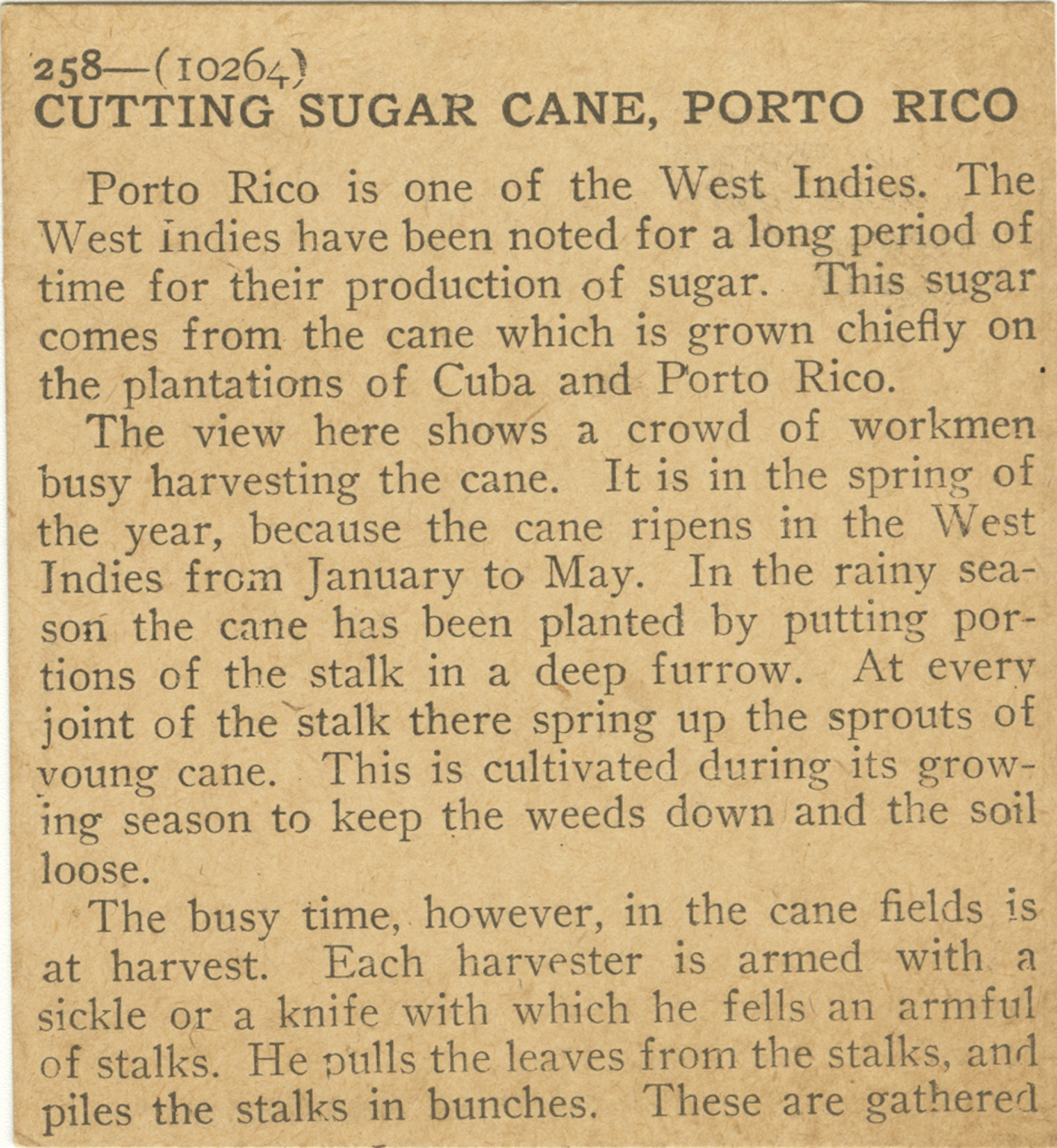 Porto Rico is one of the West Indies. The West Indies have been noted for a long period of time for their production of sugar. This sugar comes from the cane which is grown chiefly on the plantations of Cuba and Porto Rico. The view here shows a crowd of workmen busy harvesting the cane. It is in the spring of the year, because the cane ripens in the West Indies from January to May. In the rainy season the cane has been planted by putting portions of the stalk in a deep furrow. At every joint of the stalk there spring up the sprouts of young cane. This is cultivated during its growing season to keep the weeds down and the soil loose. The busy time, however, in the cane fields is at harvest. Each harvester is armed with a sickle or a knife with which he fells an armful of stalks. He pulls the leaves from the stalks, and piles the stalks in bunches. These are gathered