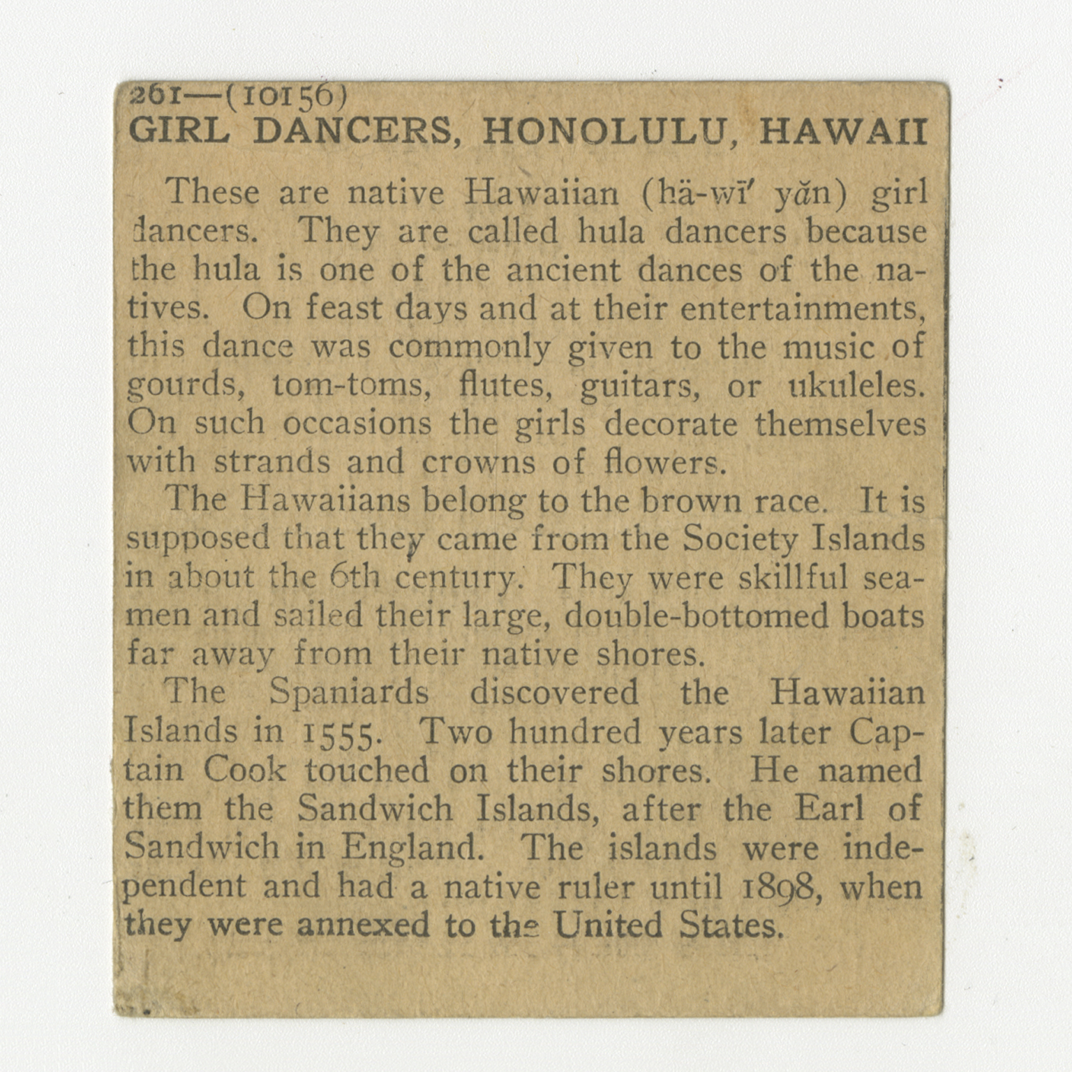 These are native Hawaiian girl dancers. They are called hula dancers because the hula is one of the ancient dances of the natives. On feast days and at their entertainments, this dance was commonly given to the music of gourds, tom-toms, flutes, guitars, or ukuleles. On such occasions the girls decorate themselves with strands and crowns of flowers. The Hawaiians belong to the brown race. It is supposed that they came from the Soviety Islands in about the 6th century. They were skillful seamen and sailed their large, double-bottomed boats far away from their native shores. The Spaniards discovered the Hawaiian Islands in 1555. Two hundred years later Captain Cook touched on their shores. He names the Sandwich Island, after the Earl of Sandwich in England. The islands were independent and had a native ruler until 1898, when they were annexed to the United States.