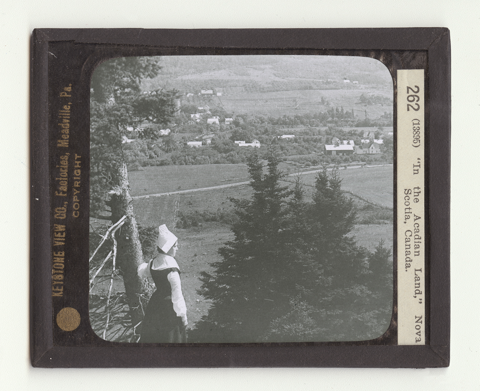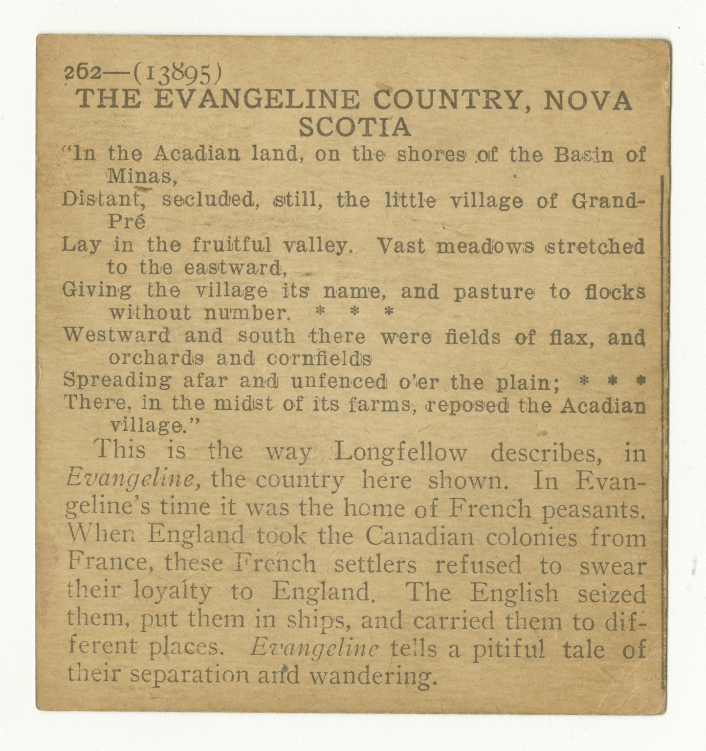 "In the Acadian land, on the shores of the Basin Minas, Distant, secluded, still the little village of Gran Pré Lay in the fruitful valley. Vast meadows stretched to the eastward, Giving the village its name, and pasture to flocks without number. ***Westward and south there were fields of flax, and orchards and cornfields Spreading afar and unfenced o'er the plain;*** There, in the midst of its farms, reposed the Acadia village." This is the way Longfellow describes, in Evangeline, the country here shown. In Evangeline's time it was the home of the French peasants. When England took the Canadian colonies from France, these French settlers refused to swear their loyalty to England. The English seize them, put them in ships, and carried them to different places. Evangeline tells a pitiful tale of their separation and wandering.