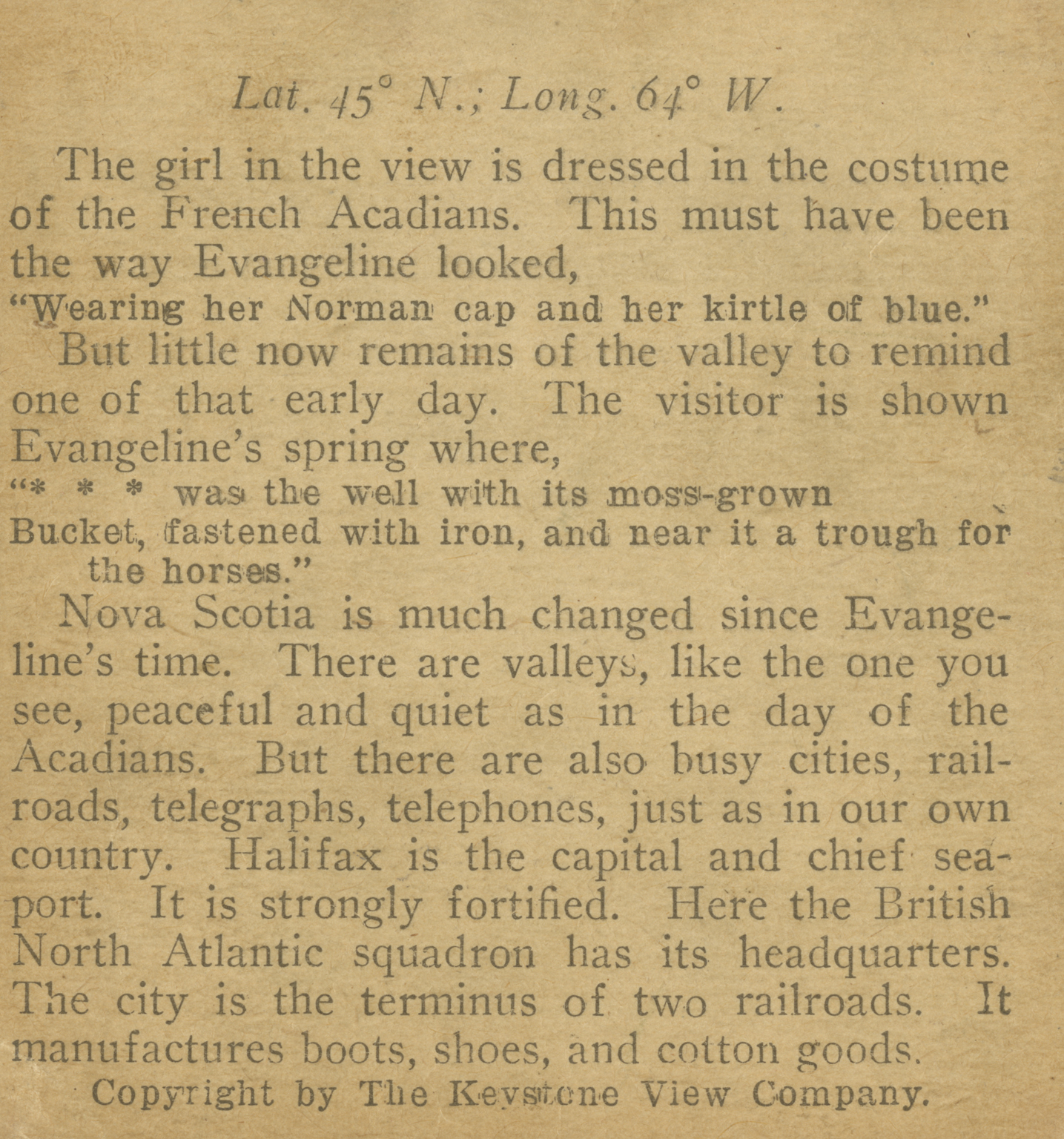 The girl in the view is dressed in the costume of the French Acadians. This must have been the way Evangeline looked. "Wearing her Norman cap and her kirtle of blue." But little now remains of the valley to remind one of that early day. The visitor is shown Evangeline's spring where, "*** was the well with its moss-grown Bucket, fastened with iron, and near it a trough for the horses." Nova Scotia is much changed since Evangeline's time. There are valleys, like the one you see, peaceful and quiet as in the day of the Acadians. But there are also busy cities, railroads, telegraphs, telephones, just as in our country. Halifax is the capital and chief sea-port. It is strongly fortified. Here the British North Atlantic squadron has its headquarters. The city is the terminus of two railroads. It manufactures boots, shoes, and cotton goods.