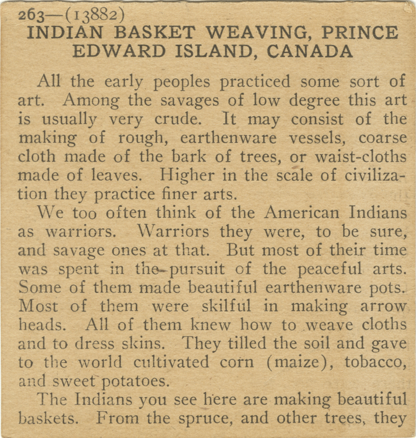 All the early peoples practiced some sort of art. Among the savages of low degree this art is usually very crude. It may consist of the making of rough, earthenware vessels, coarse cloth made of the bark of trees, or waist-cloths made of leaves. Higher in the scale of civilization they practice finer arts. We too often think of the American Indians as warriors. Warriors they were, to be sure, and savage ones at that. But most of their time was spent in the pursuit of the peaceful arts. Some of them made beautiful earthenware pots. Most of them were skillful in making arrow heads. All of them knew how to weave cloths and to dress skins. They tilled the soil and gave to the world cultivated corn (maize), tobacco, and sweet potatoes. The Indians you see here are making beautiful baskets. From the spruce, and other trees, they