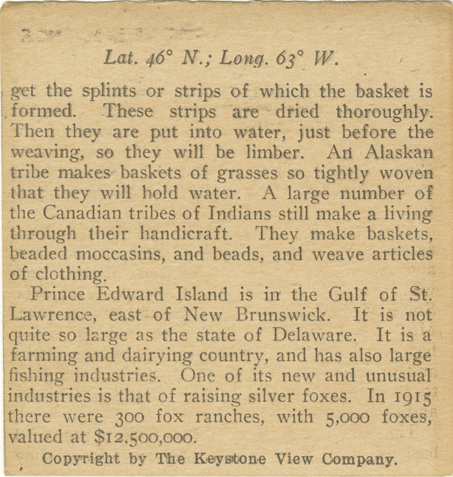 get the splints or strips of which the basket is formed. These strips are dried thoroughly. The they are put into water, just before the weaving, so they will be limber. An Alaskan tribe makes baskets of grasses so tightly woven that they will hold water. A large number of the Canadian tribes of Indians still make a living through their handicraft. They make baskets, beaded moccasins, and beads, and weave articles of clothing. Prince Edward Island is in the Gulf of St. Lawrence, east of New Brunswick. It is not quite so large as the state of Delaware. It is a farming and dairying country, and has also large fishing industries. One of its new and unusual industries is that of raising silver foxes. In 1915 there were 300 fox ranches, with 5,000 foxes, valued at $12,500,000.