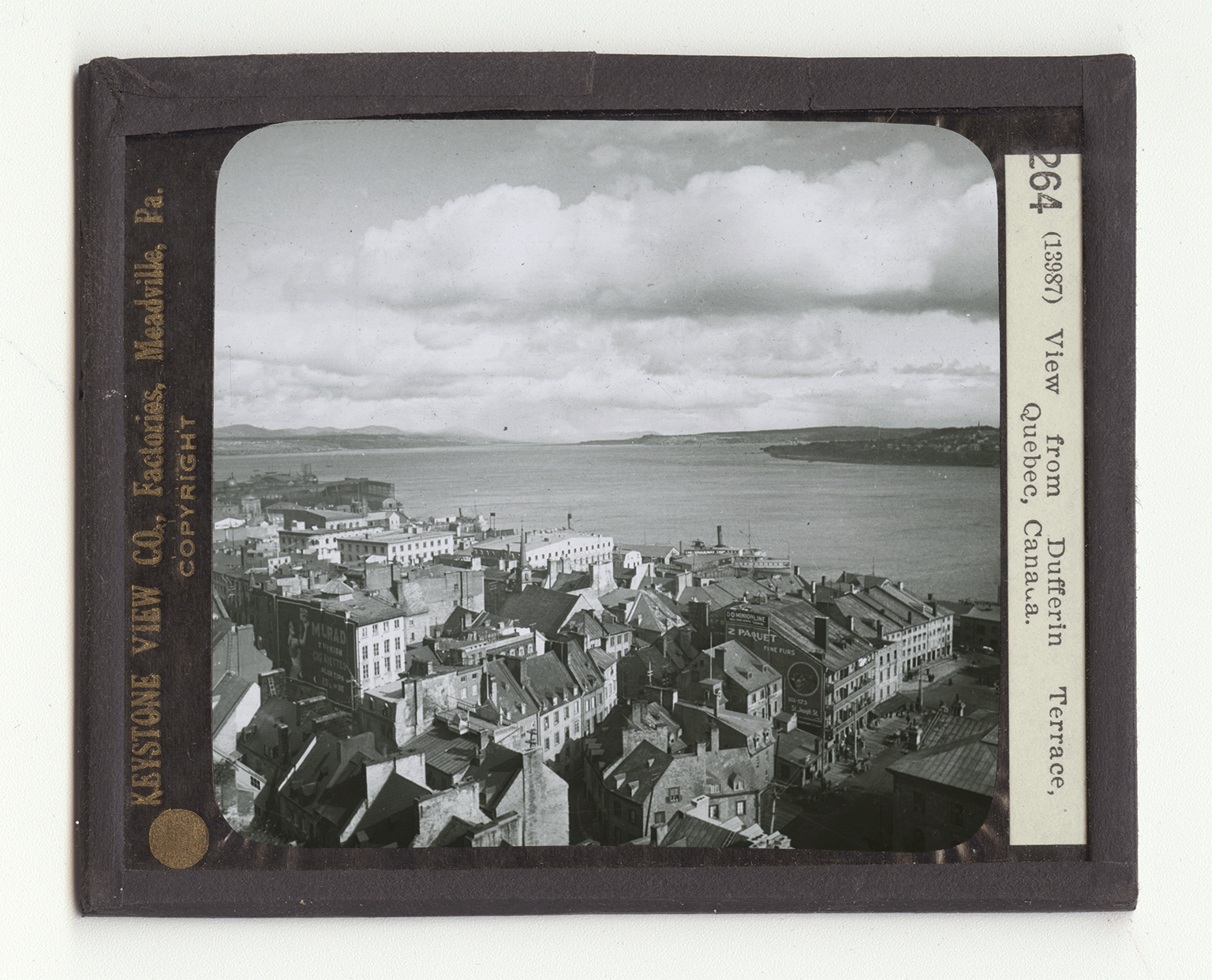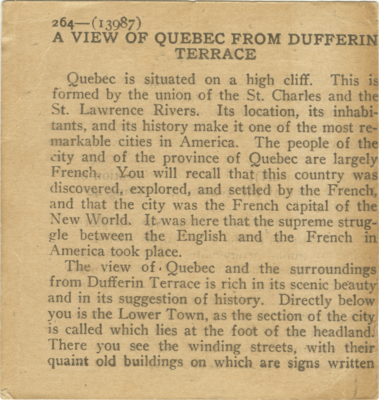 Quebec is situated on a high cliff. This is formed by the union of the St. Charles and the St. Lawrence Rivers. Its location, its inhabitants, and its history make it one of the most remarkable cities in America. The people of the city and of the province of Quebec are largely French. You will recall that this country was discovered, explored, and settled by the French, and that the city was the French capital of the New World. It was here that the supreme struggle between the English and the French in America took place. The view of Quebec and the surroundings from Duffering Terrace is rich in its scenic beauty and in its suggestion of history. Directly below you is the Lower Town, as the section of the city is called which lies at the foot of the headland. There you see the winding streets, with their quaint old buildings on which are signs written