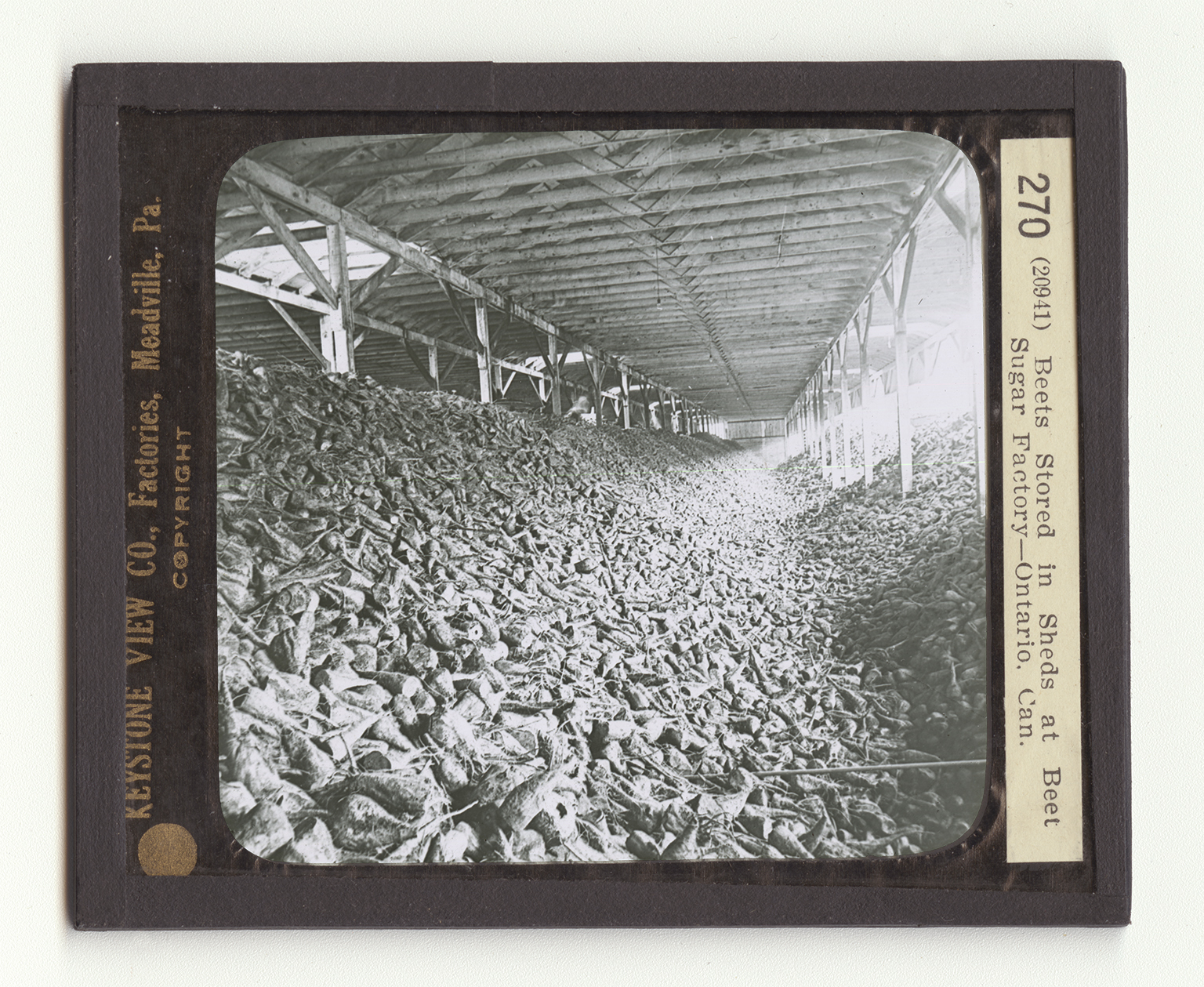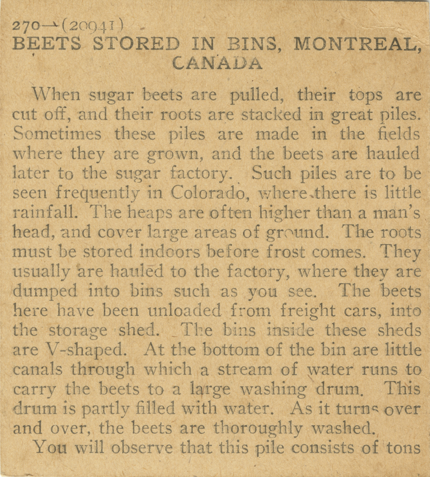 When sugar beets are pulled, their tops are cut off, and their roots are stacked in great piles. Sometimes these piles are made in the fields where they are grown, and the beets are hauled later to the sugar factory. Such piles are to be seen frequently in Colorado, where there is little rainfall. The heaps are often higher than a man's head, and cover large areas of ground. The roots must be stored indoors before frost comes. They usually are hauled to the factory, where they are dumped into bins as you see. The beets here have been unloaded from freight cars, into the storage shed. The bins inside these sheds are V-shaped. At the bottom of the bin are little canals through which a stream of water runs to carry the beets to a large washing drum. This drum is partly filled with water. As it turns over and over, the beets are thoroughly washed. You will observe that this pile consists of tons