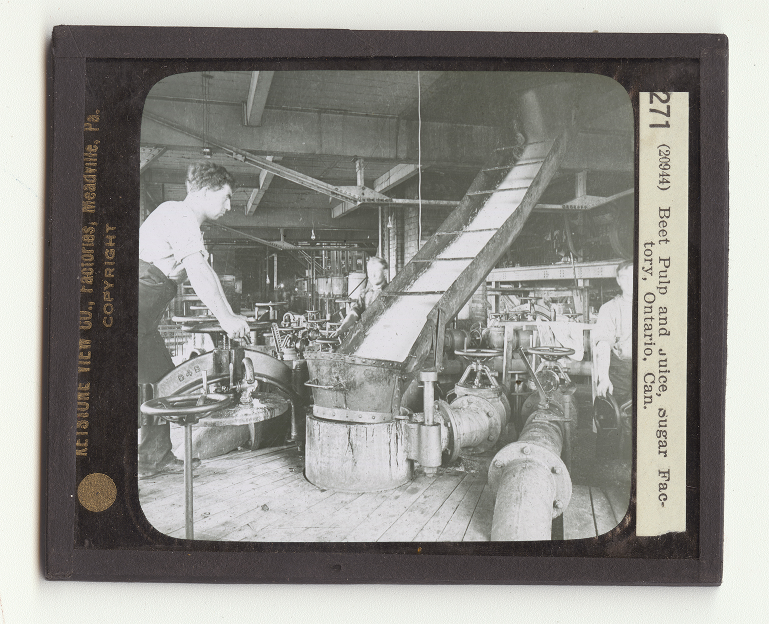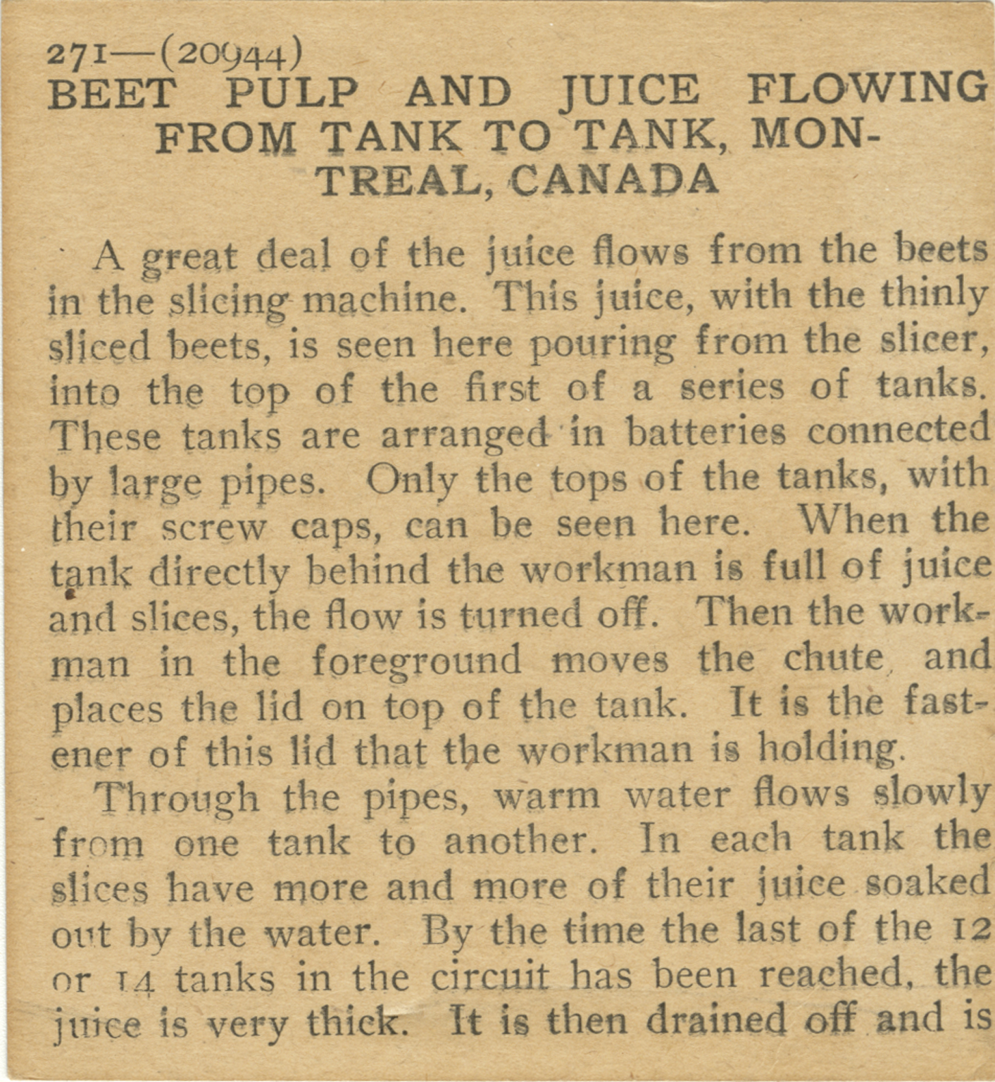 A great deal of the juice flows from the beets in the slicing machine. This juice, with the thinly sliced beets, is seen here pouring from the slicer, into the top of the first of a series of tanks. These tanks are arranged in batteries connected by large pipes. Only the tops of the tanks, with their screw caps, can be seen here. When the tank directly behind the workman is full of juice and slices, the flow is turned off. Then the workman in the foreground moves the chute, and places the lid on top of the tank. It is the fastener of this lid that the workman is holding. Through the pipes, warm water flows slowly from one tank to another. In each tank the slices have more and more of their juice soaked out by the water. By the time the last of the 12 or 14 tanks in the circuit has been reached, the juice is very thick. It is then drained off and is