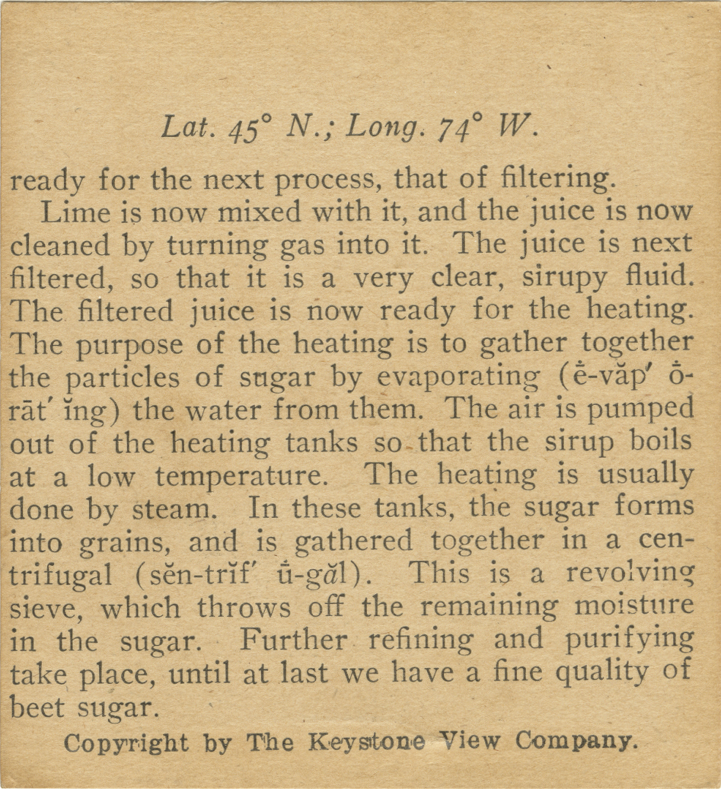 ready for the next process, that of filtering. Lime is now mixed with it, and the juice is now cleaned by turning gas into it. The Juice is next filtered, so that it is a very clear, sirupy fluid. The filtered juice is now ready for the heating. The purpose of the heating is to gather together the particles of sugar by evaporating the water from them. The air is pumped out of the heating tanks so that the sirup boils at a low temperature. The heating is usually done by steam. In these tanks, the sugar forms into grains, and is gathered together in a centrifugal. This is a revolting sieve, which throws off the remaining moisture in the sugar. Further refining and purifying take place, until at last we have a fine quality of beet sugar.