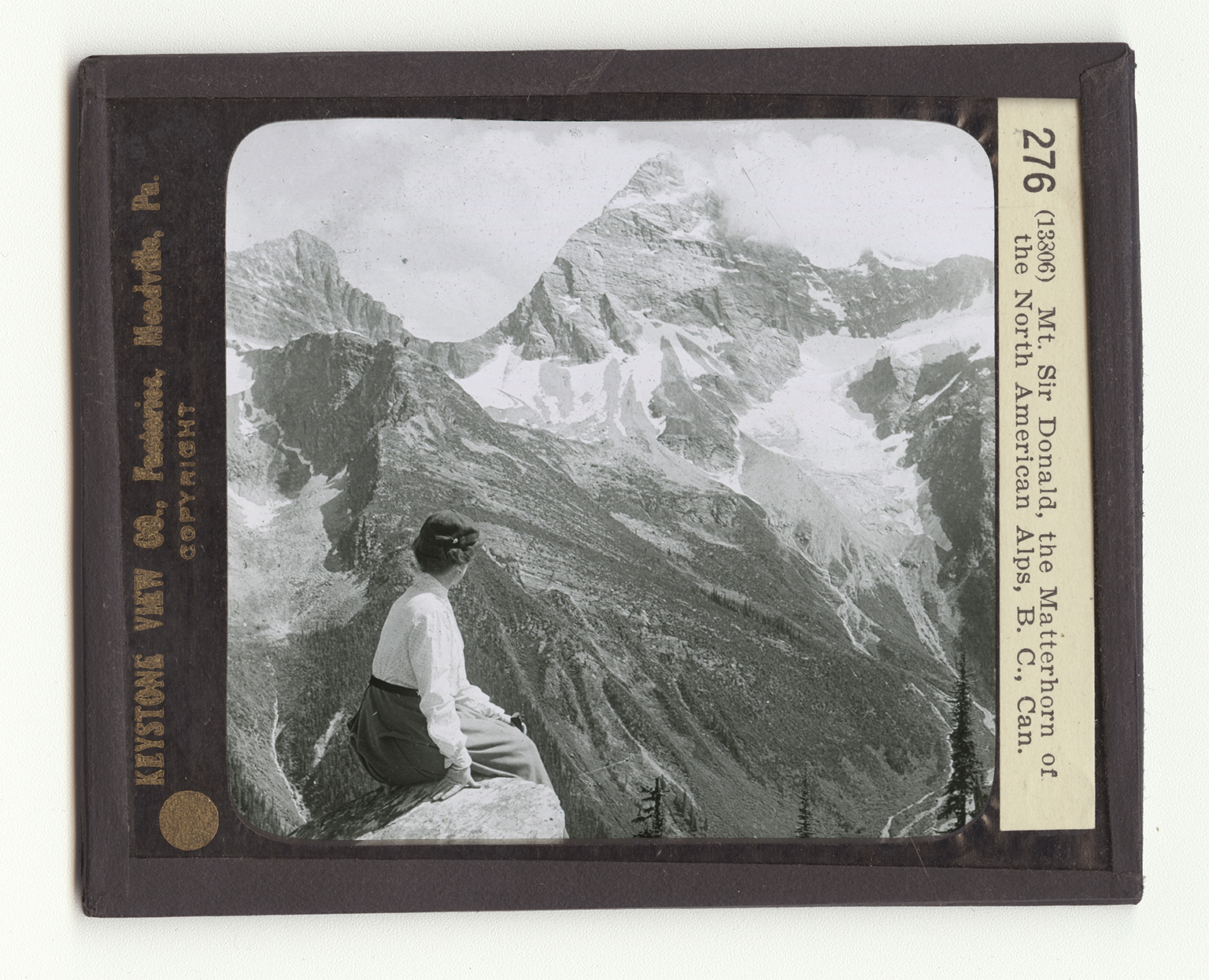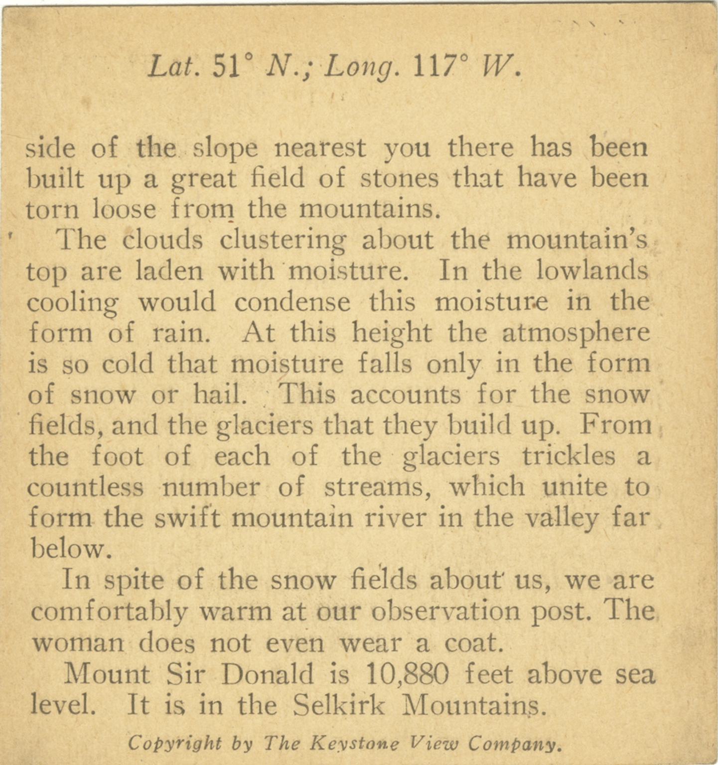 side of the slope nearest you there has been built up a great field of stones that have been torn loose from the mountains. The clouds clustering about the mountain's top are laden with moisture. In the lowlands cooling would condense this moisture in the form of rain. At this height the atmosphere is so cold that moisture falls only in the form of snow or hail. This accounts for the snow fields, and the glaciers that they built up. From the foot of each of the glaciers trickles a countless number of streams, which unite to form the swift mountain river in the valley far below. In spite of the snow fields about us, we are comfortably warm at our observation post. The woman foes not even wear a coat. Mount Sir Donald is 10,880 feet above sea level. It is in the Selkirk Mountains.