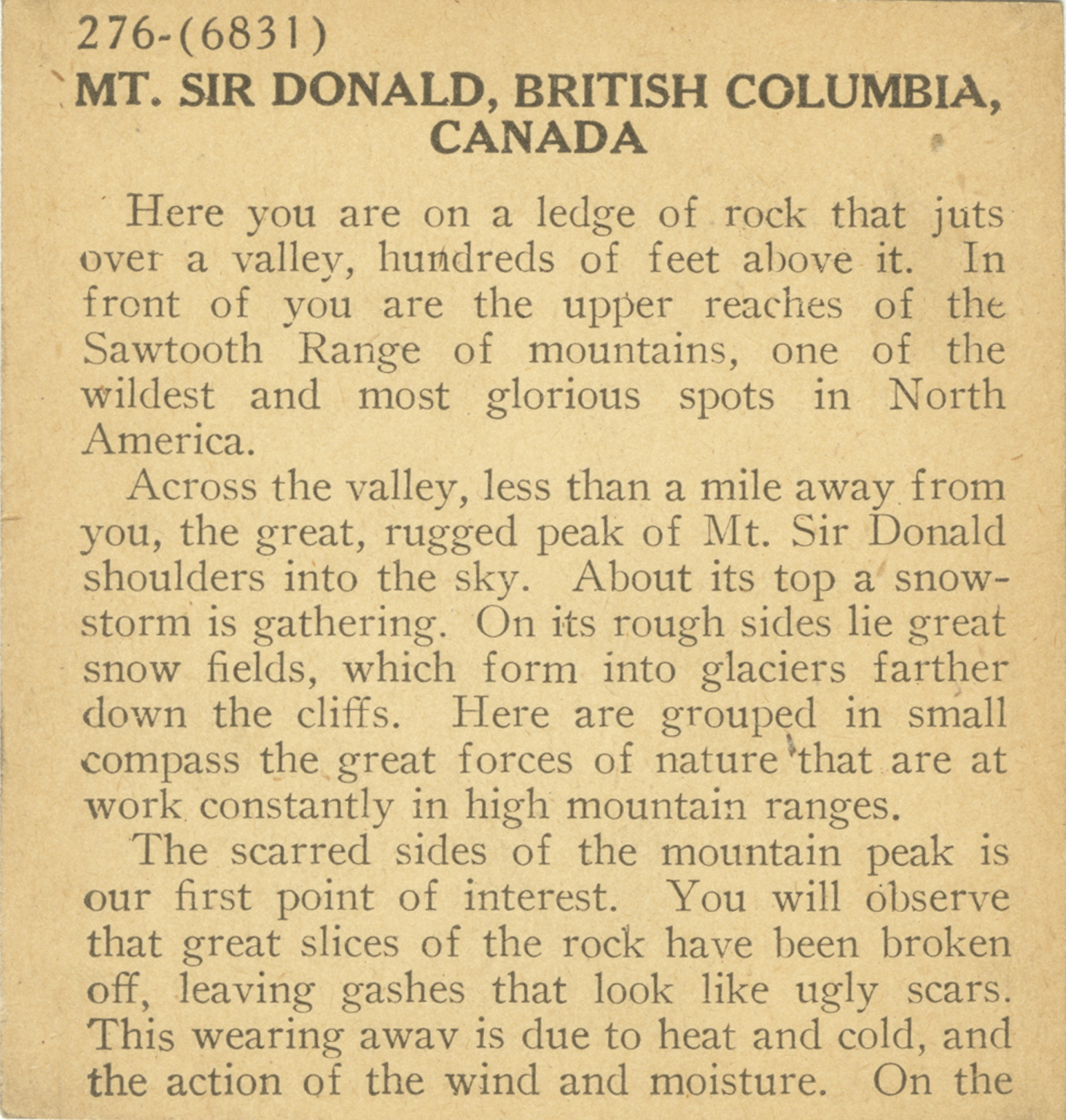 Here you are on a ledge of rock that juts over a valley, hundreds of feet above it. In front of you are the upper reaches of the Sawtooth Range of mountains, one of the wildest and most glorious spots in North America. Across the valley, less than a mile away from you, the great, rugged peak of Mt. Sir Donald shoulders into the sky. About its top a snowstorm is gathering. On its rough sides lie great snow fields, which form into glaciers farther down the cliffs. Here are grouped in small compass the great forces of nature that are at work constantly in high mountain ranges. The scarred sides of the mountain peak is our first point of interest. You will observe that great point of interest. You will observe that great slices of the rock have been broken off, leabing gashes that look like ugly scars. This wearing away is due to heat and cold, and the action of the wind and moisture. On the