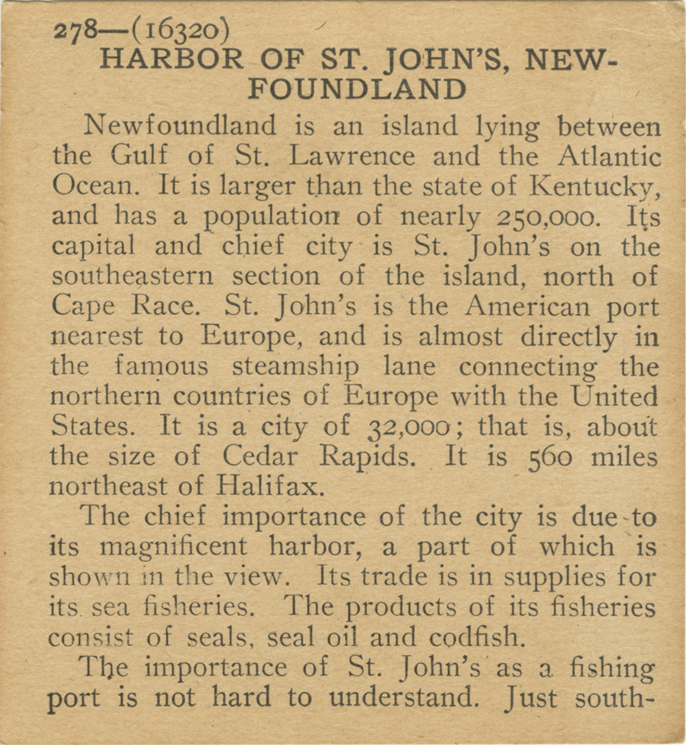 Newfoundland is an island lying between the Gulf of St. Lawrence and the Atlantic Ocean. It is larger than the state of Kentucky, and has a population of nearly 250,000. Its capital and chief city is St. John's on the southeastern section of the island, north of Cape Race. St. John's is the American port nearest to Europe, and is almost directly in the famous steamship lane connecting the northern countries of Europe with the United States. It is a city of 32,000; that is, about the size of Cedar Rapids. It is 560 miles northeast of Halifax. The chief importance of the city is due to its magnificent harbor, a part of which is shown in the view. Its trade is in supplies for its sea fisheries. The products of its fisheries consist of seals, seal oil and codfish. The importance of St. John's as a fishing port is not hard to understand. Just south-