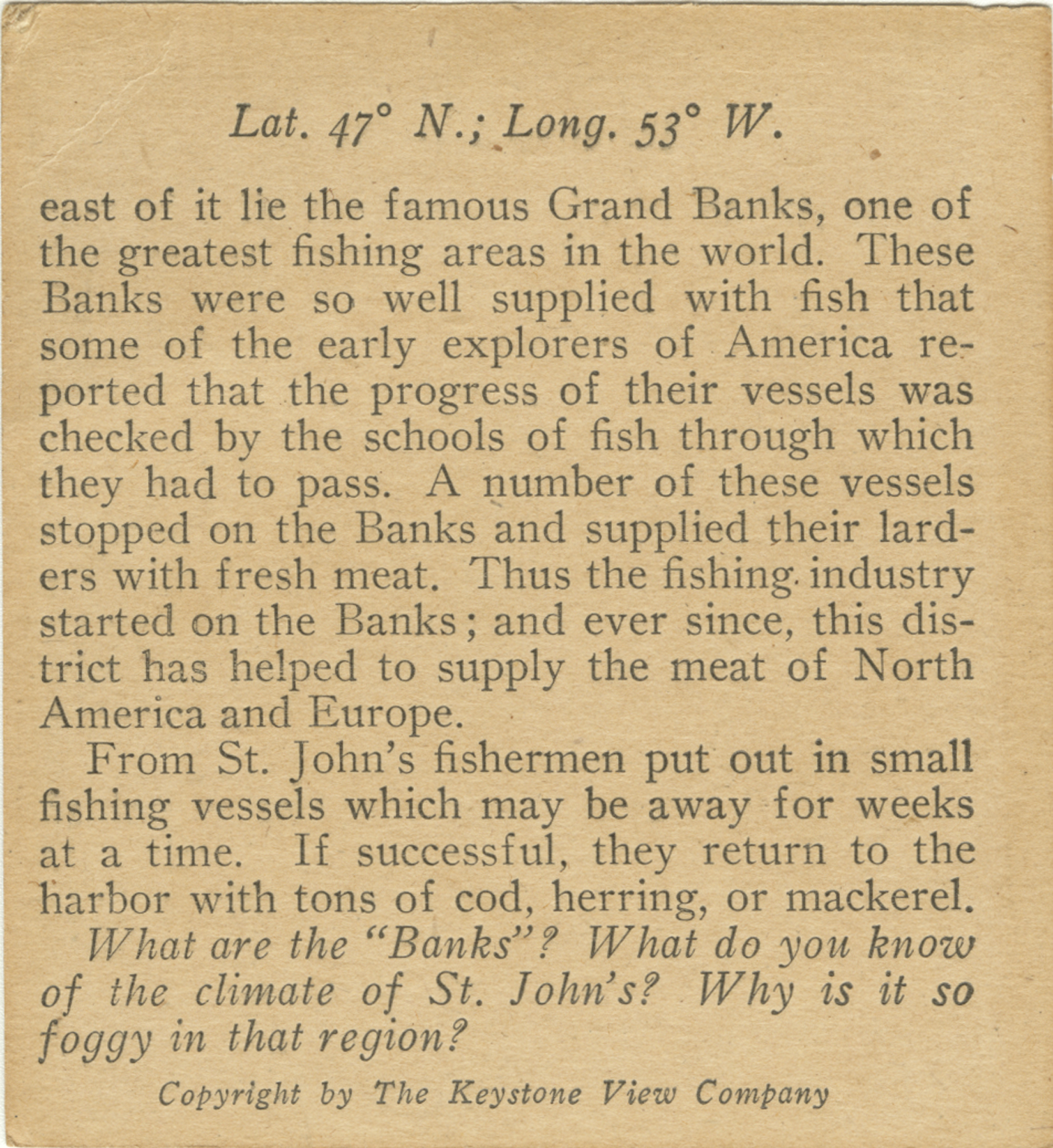 est of it lie the famous Grand Banks, one of the greatest fishing areas in the world. These Banks were so well supplied with fish that some of the early explorers of America reported that the progress of their vessels was checked by the schools of fish through which they had to pass. A number of these vessels stopped on the Banks and supplied their larders with fresh meat. Thus the fishing industry started on the Banks; and ever since, this district has helped to supply the meat of North America and Europe. From St. John's fishermen put out in small fishing vessels which may be away for weeks ata time. If successful, they return to the harbor with tons of cod, herring, or macherel. What are the "Banks"? What do you know of the climate of St. John's? Why is it so foggy in that region?