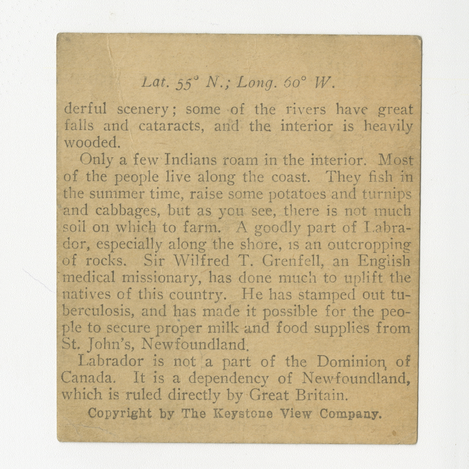 derful scenery; some of the rivers have great falls and cataracts, and the interior is heavily wooded. Only a few Indians roam in the interior. Most of the people live on the coast. They fish in the summer time, raise some potatoes and turnips and cabbages, but as you see, there is not much soil on which to farm. A goodly part of Labrador, especially along the shore, is an outcropping of rocks. Sir Wilfred T. Grenfell, an English medical missionary, has done much to uploft the natives of this country. He has stamped out tuberculosis, and has made it possible for the people to secure proper milk and food supplies from St. John's, Newfoundland. Labrador is not a part of the Dominion, of Canada. It is a dependency of Newfoundland, which is ruled directly by Great Britain.