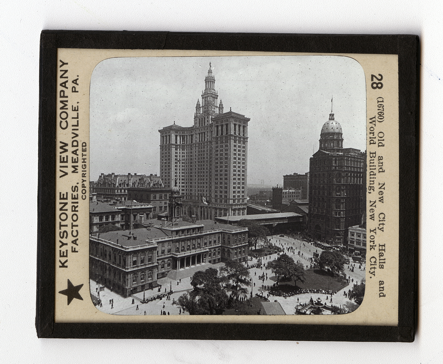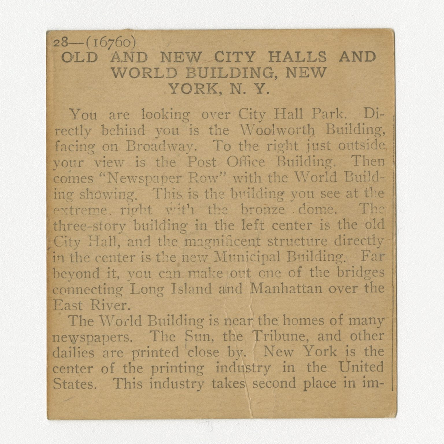 You are looking over City Hall Park. Directly behind you is the Woolworth Building, facing on Broadway. To the right just outside your view is the Post Office Building. Then comes "Newspaper Row" with the World Building showing. This is the building you see at the extreme right with the bronze dome. The three-story building in the left center is the old City Hall, and the magnificent structure directly in the center is the new Municipal Building. Far beyond it, you can make out one of the bridges connecting Long Island and Manhattan over the East River. The World Building is near the homes of many newspapers. The Sun, the Tribune, and other dailies are printed close by. New York is the center of the printing industry in the United States. This industry takes second place in im-