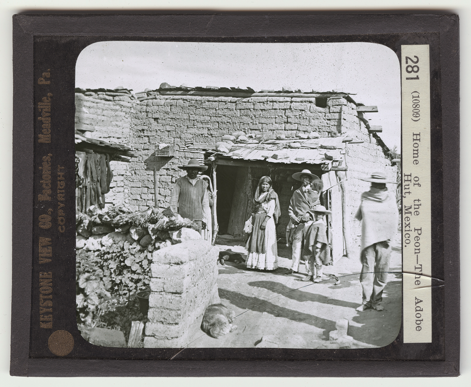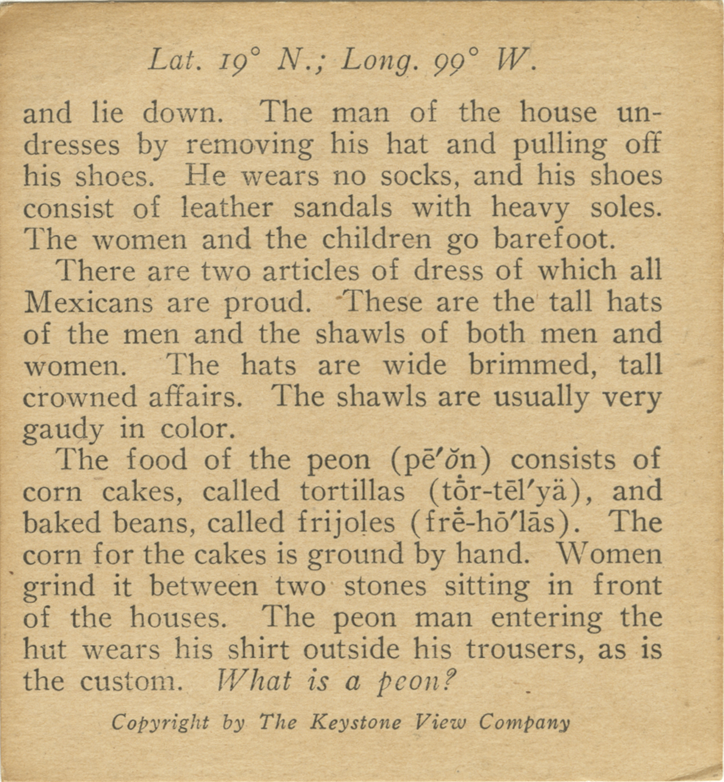 and lie down. The man of the house undresses by removing his hat and pulling off his shoes. He wears no socks, and his shoes consist of leather sandals with heavy soles. The women and the children go barefoot. There are two articles of dress of which all Mexicans are proud. These are the tall hats of the men and the shawls of both men and women. The hats are wide brimmed, tall crowned affairs. The shawls are usually very gaudy in color. The food of the peon consists of corn cakes, called tortillas, and baked beans, called frijoles. The corn for the cakes is ground by hand. Women grind it between two stones sitting in front of the houses. The peon man entering the hut wears his shirt outside his trousers, as is the custom. What is a peon?