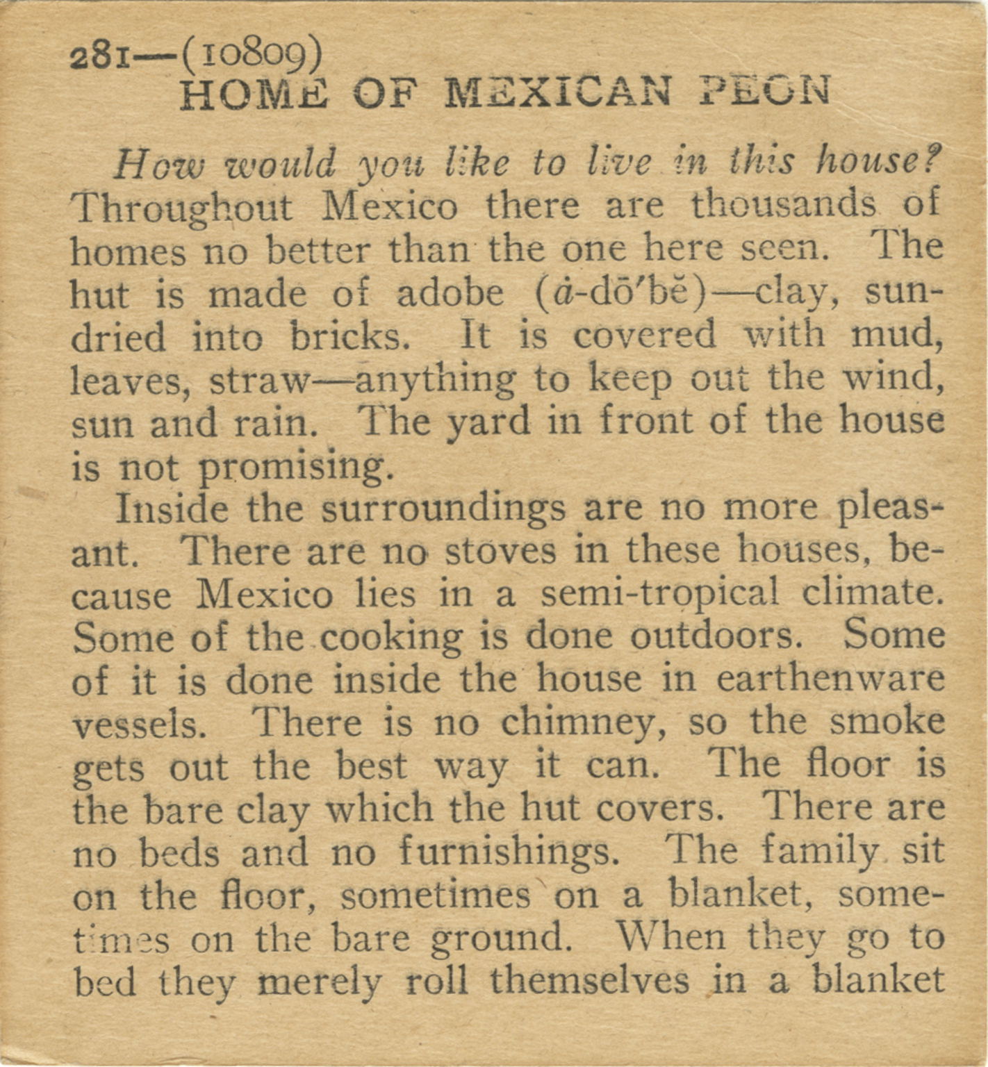 How would you like to live in this house? Throughout Mexico there are thousands of homes no better than the one here seen. The hut is made of adobe - clay, sundried into bricks. It is covered with mud, leaves, straw - anything to keep out the wind, sun and rain. The yard in front of the house is not promising. Inside the surroundings are no more pleasant. There are no stoves in these houses, because Mexico lies in a semi-tropical climate. Some of the cooking is done outdoors. Some of it is done inside the house in earthenware vessels. There is no chinmey, so the smoke gets out the best way it can. The floor is the bare clay which the hut covers. There are no beds and no furnishings. The family sit on the floor, sometimes on a blanket, sometimes on the bare ground. When they go to bed they merely roll themselves in a blanket