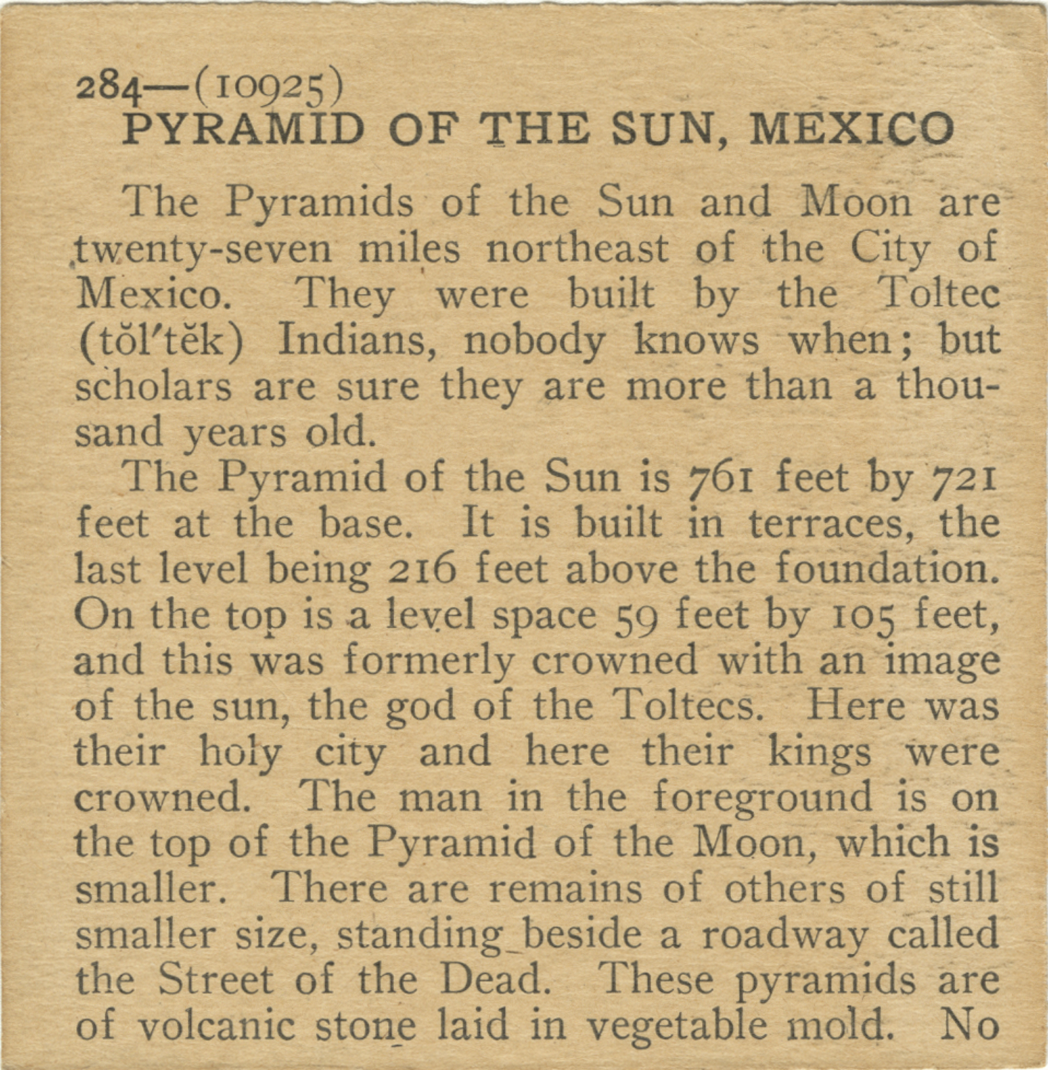 The Pyramids of the Sun and Moon are twenty-seven miles northeast of the City of Mexico. They were built by the Toltec Indians, nobody knows when; but scholars are sure they are more than a thousand years old. The Pyramid of the Sun is 761 feet by 721 feet at the base. It is built in terraces, the last level being 216 feet above the foundation. On the top is a level space 59 feet by 105 feet, and this was formerly crowned with an image of the sun, the god of the Toltecs. Here was their holy city and here their kings were crowned. The man in the foreground is on the top of the Pyramid of the Moon, which is smaller. There are remains of others of still smaller size, standing beside a roadway called the Street of the Dead. These pyramids are of volcanic stone laid in vegetable mold. No