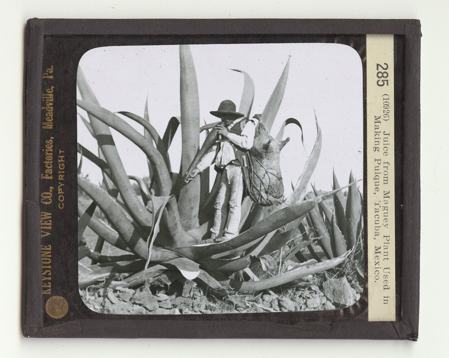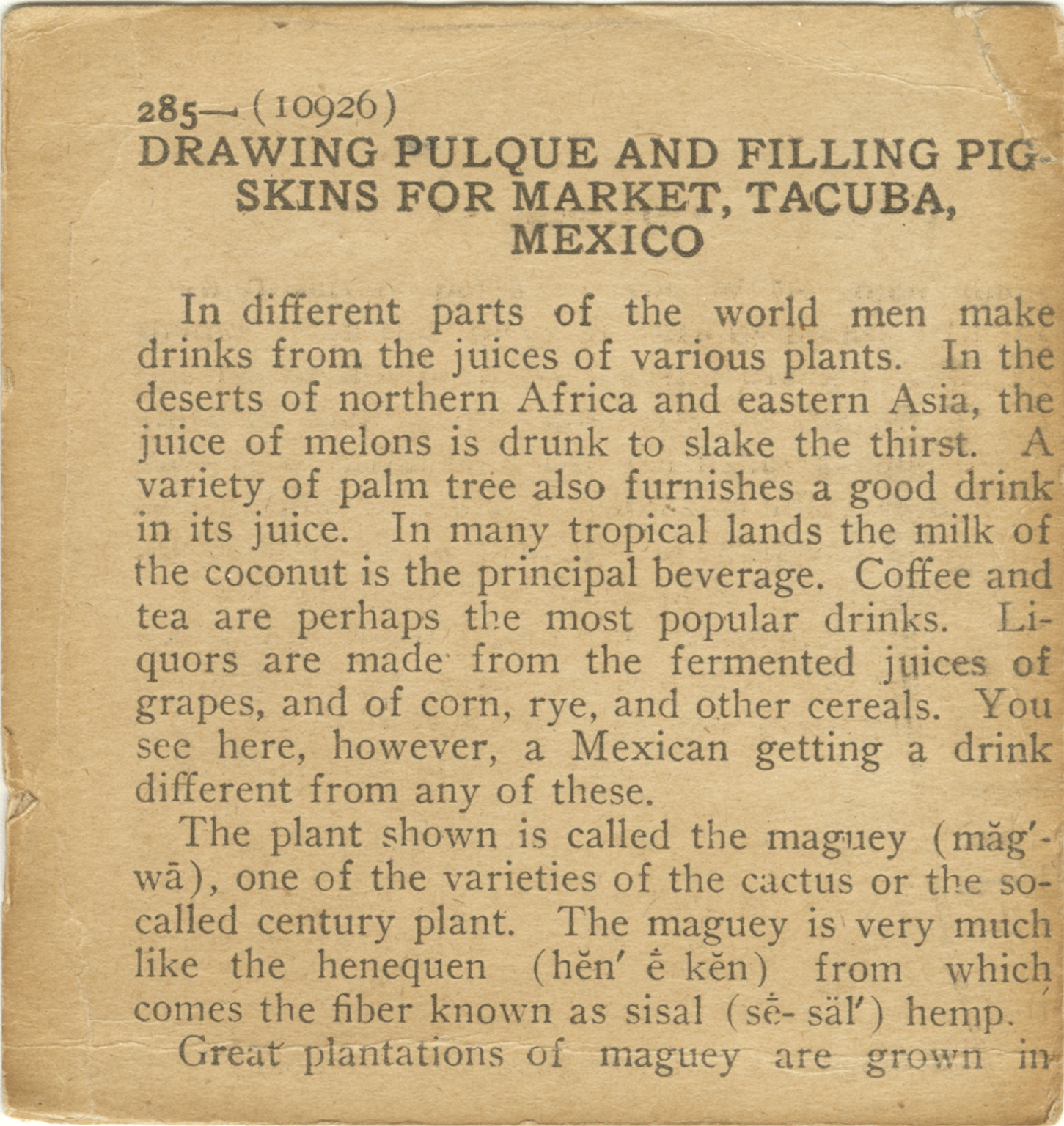 In different parts of the world men make drinks from the juice of various plants. In the deserts of northern Africa and eastern Asia, the juice of melons is drunk to slake the thirst. A variety of palm tree also furnishes a good drink in its juice. In many tropical lands the milk of the coconut is the principal beverage. Coffee and tea are perhaps the most popular drinks. Liquours are made from the fermented juices of grapes, and of corn, rye, and other cereals. You see here, however, a Mexican getting a drink different from any of those. The plant shown is called the maguey (mag' wa), one of the varieties of the cactus or the so-called century plant. The maguey is very much like the henequen (hen' e ken) from which comes the fiber known as sisal hemp. Great plantations of maguey are grown in