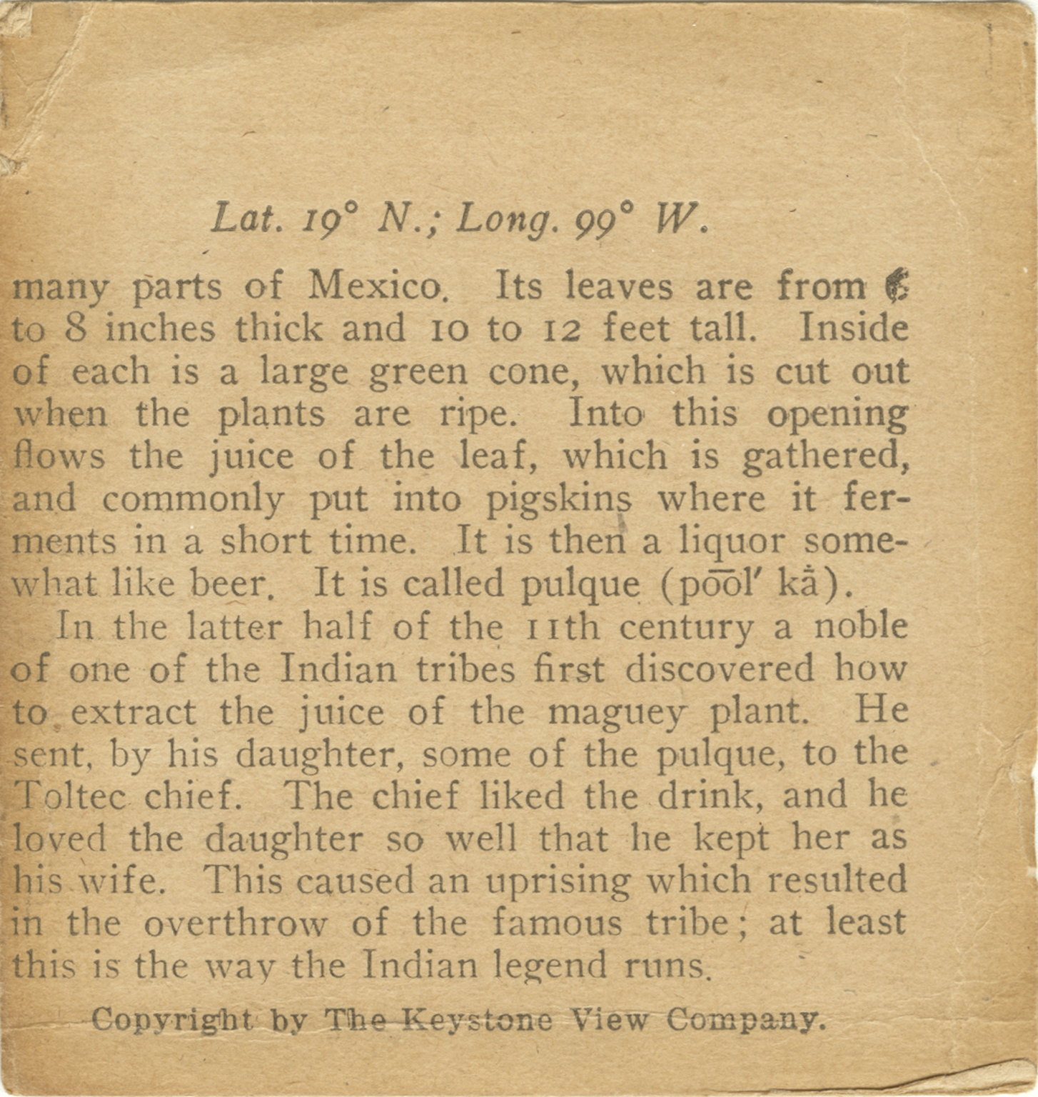 many parts of Mexico. Its leaves are from 6 to 8 inches thich and 10 to 12 feet tall. Inside of each is a large green cone, which is cut out when the plants are ripe. Into this opening flows the juice of the leaf, which is gathered, and commonly put into pigskins where it ferments in a short time. It is then a liquour somewhat like beer. It is called pulque. In the letter half of the 11th century of a noble of one of the Indian tribes first discovered how to extract the juice of the maguey plant. He sent by his daughter, some of the pulque, to the Toltec chief. The chief liked the drink, and he loved the daughter so well that he kept her as his wife. This caused an uprising which resulted in the overthrow of the famous tribe; at least this is the way the Indian legend runs.