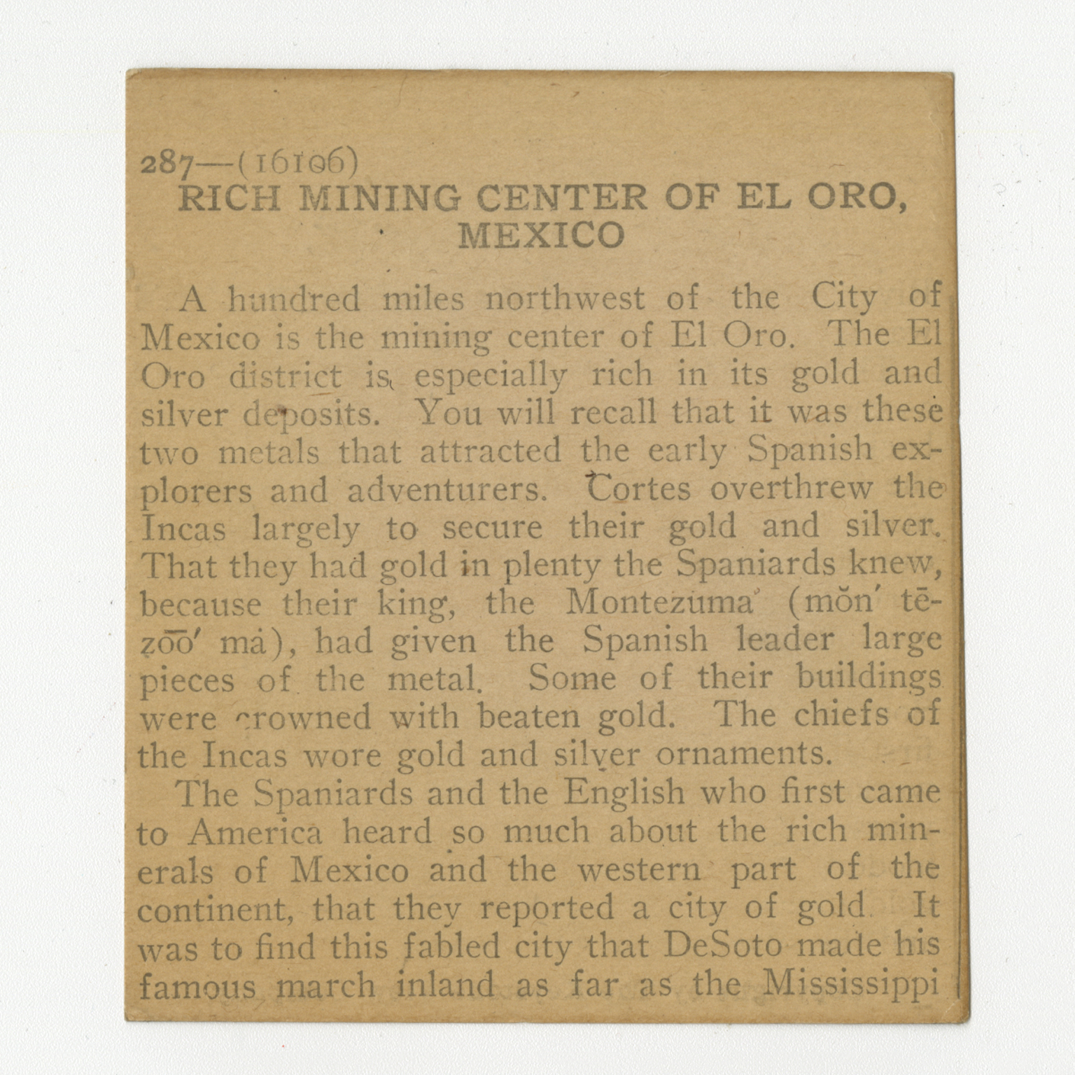 A hundred miles northwest of the city of Mexico is the mining center of El Oro. The El Oro district is especially rich in its gold and silver deposits. You will recall that it was these two metals that attracted the early Spanish explorers and adventures. Cortes overthrew the Incas largely to secure their gold and silver. That they had gold in plenty the Spaniards knew, because their king, the Montezuma, had given the Spanish leader large pieces of the metal. Some of their buildings were crowned with beaten gold. The chiegs of the Incas wore gold and silver ornaments. The Spaniards and the English who first came to America heard so much about the rich minerals of Mexico and the western part of the continent, that they reported a city of gold. It was to find this fabled city that DeSoto made his famous march inland as far as the Mississippi