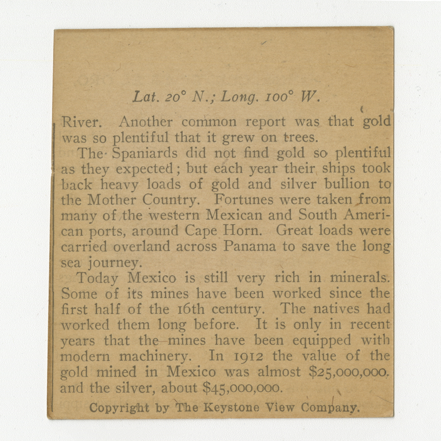 River. Another common report was that gold was so plentiful that it grew on trees. The Spaniards did not find gold so plentiful as they expected but each year their ships took back heavy loads of gold and silver bullion to the Mother Country. Fortunes were taken from many of the western Mexican and South American ports, around Cape Horn. Great loads were carried overland across Panama to save the long sea journey. Today Mexico is still very rich in minerals. Some of its mines have been worked since the first half of the 16th century. The natives had worked them long before. It is only in recent years that the mines have been equipped with modern machinery. In 1912 the value of the gold mined in Mexico was almost $25,000,000, and the silver, about $45,000,000.