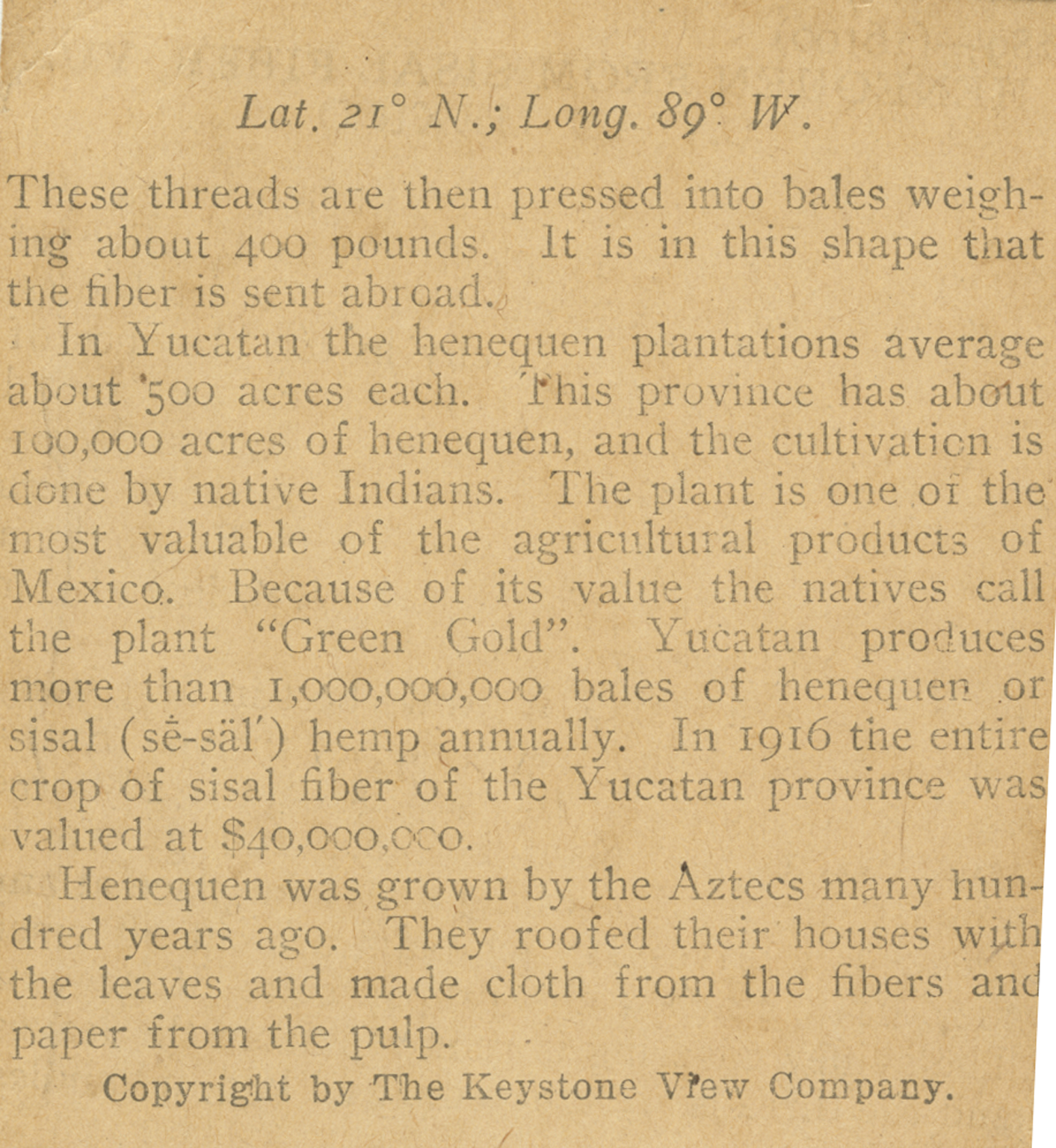 These threads are then pressed into bales weighing about 400 pounds. It is in this shape that the fiber is sent abroad. In Yucatan the henequen plantations average about 500 acres each. This province has about 100,000 acres of henequen, and the cultivation is done by native Indians. The plant is one of the most valuable of the agricultural products of Mexico. Because of its value the natives call the plant "Green Gold". Yucatan produces more than 1,000,000,000 bales of henequen or sisal hemp annually. In 1916 the entire crop of sisal fiber of the Yucatan province was valued at $40,000,000. Henequen was grown by the Aztecs many hundred years ago. They roofed their houses with the leaves and made cloth from the fibers and paper from the pulp.