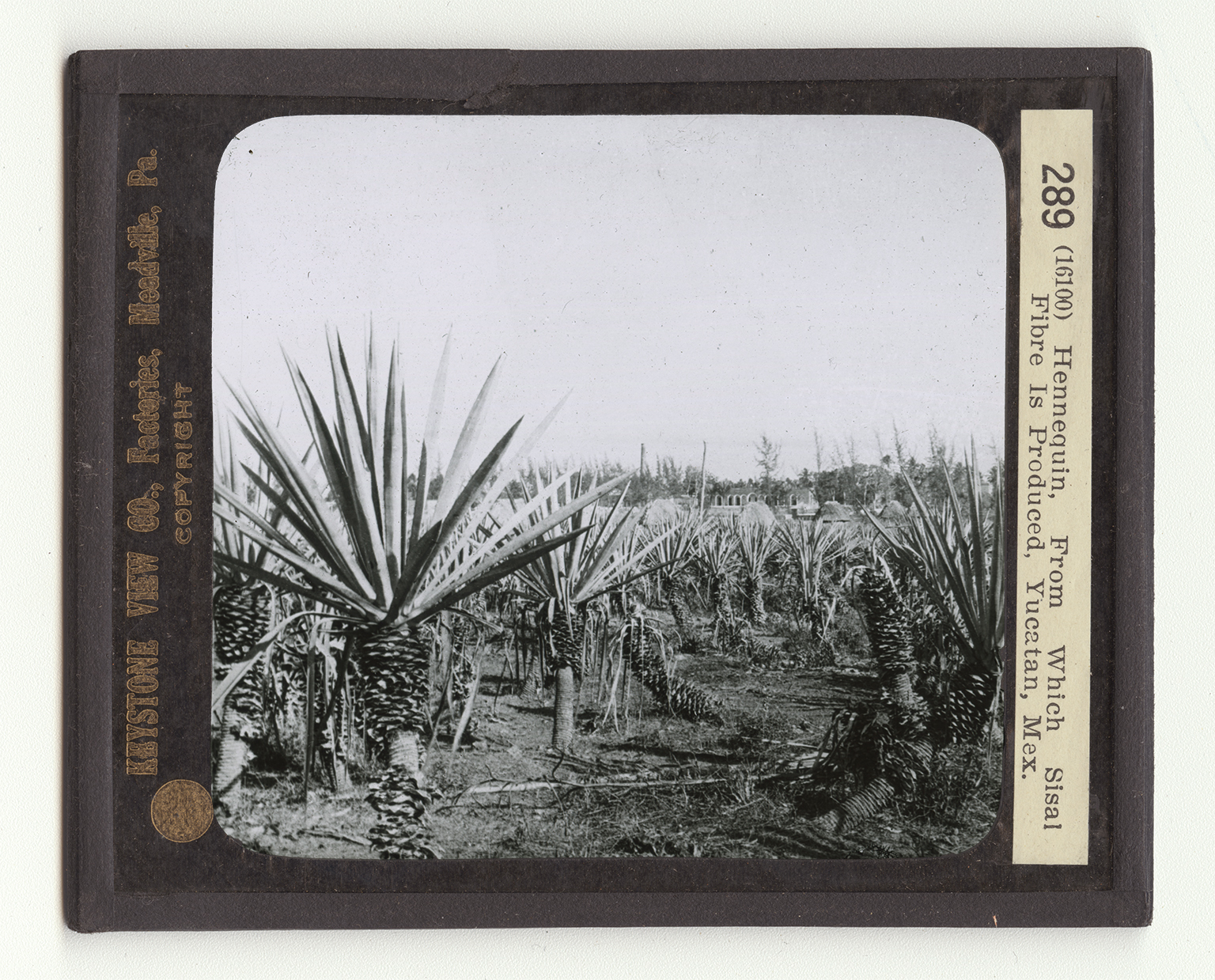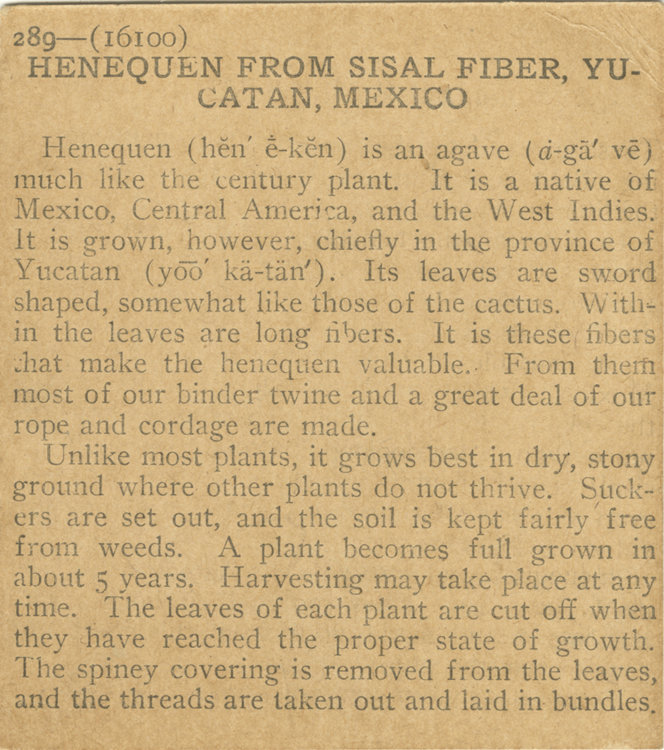 Henequen is an agave much like the century plant. It is a native of Mexico, Central America, and the West Indies. It is grown, however, chiefly in the province of Yucatan. Its leaves are sword shaped, somewhat like those of the cactus. With in the leaves are long fibers. It is these fibers that make the henequen valuable. From them most of our binder twine and a great deal of our rope and cordage are made. Unlike most plants, it grows best in dry, stony ground where other plants do not thrive. Suckers are set out, and the soil is kept fairly free from weeds. A plant becomes full grown in about 5 years. Harvesting may take place at any time. The leaves of each plant are cut off when they have reached the proper state of growth. The spiney covering is removed from the leaves, and the threads are taken out and laid in bundles.