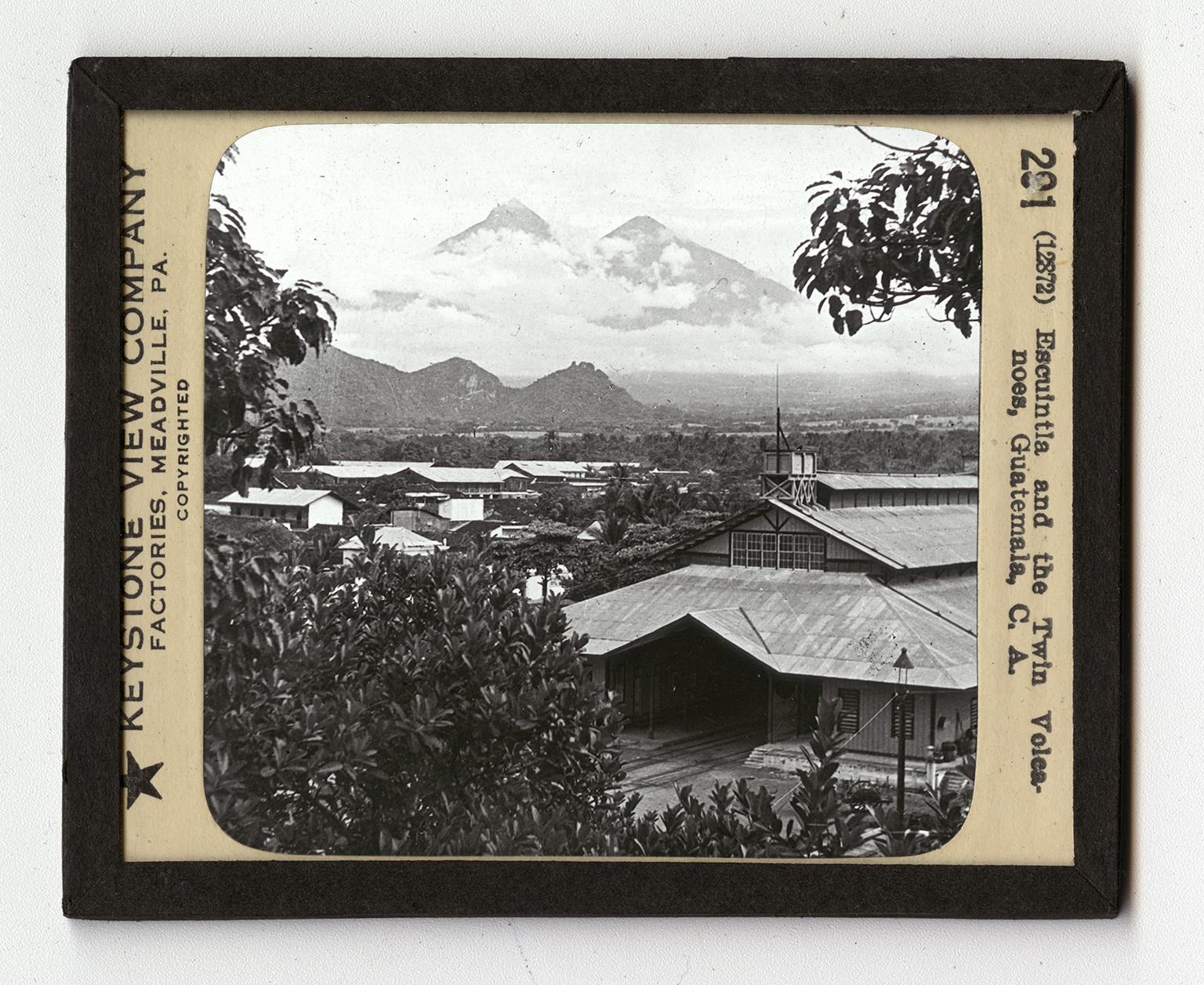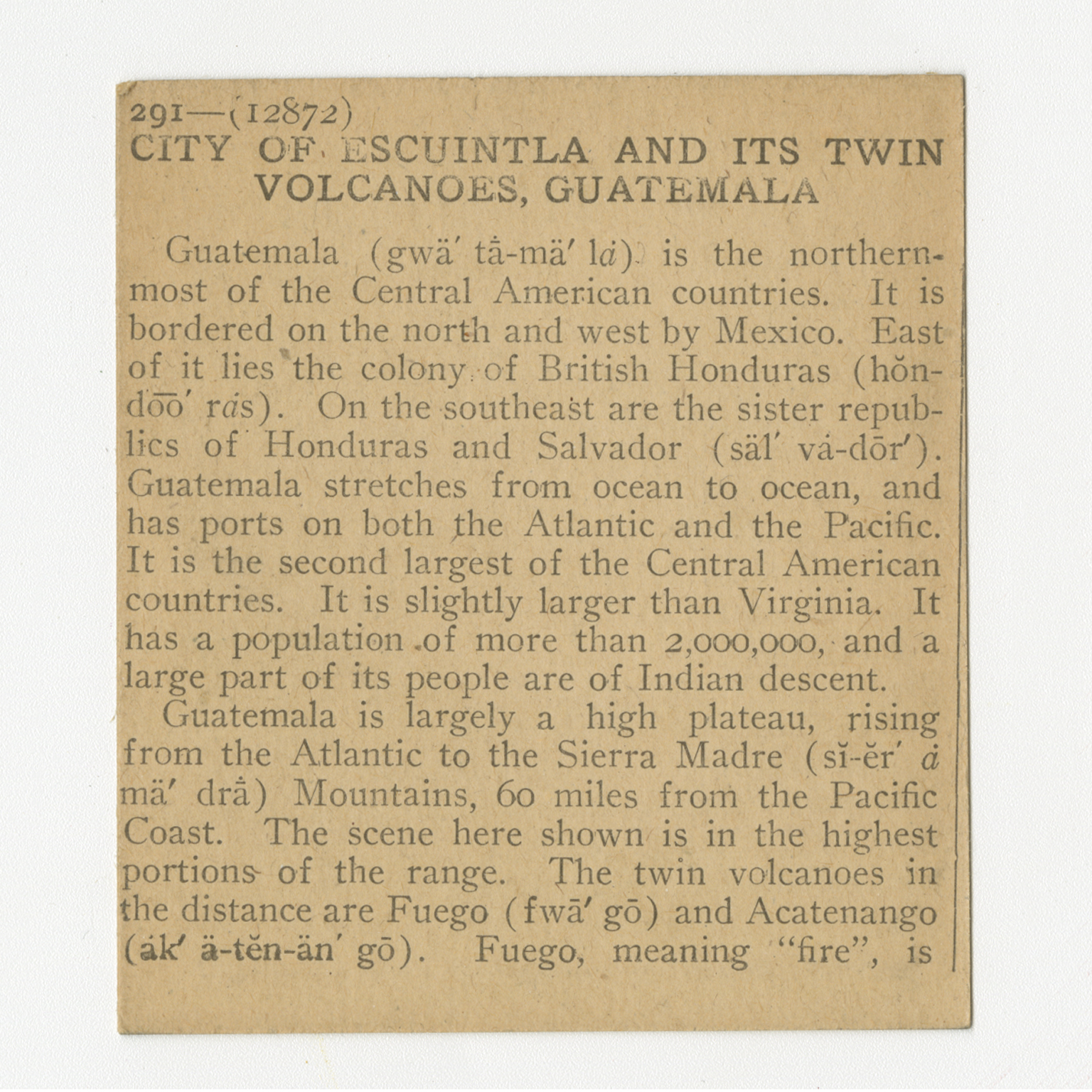 Guatemala is the northernmost of the Central American countries. It is bordered on the north and west by Mexico. East of it lies the colony of British Honduras. On the southeast are the sister republics of Honduras and Salvador. Guatemala stretches from ocean to ocean, and has ports on both the Atlantic and the Pacific. It is the second largest of the Central American countries. It is slightly larger than Virginia. It has a population of more than 2,000,000, and a large part of its people are of Indian descent. Guatemala is largely a high plateau, rising from the Atlantic to the Sierra Madre Mountains, 60 miles from the Pacific Coast. The scene here shown is in the highest portions of the range. The twin volcanoes in the distance are Fuego and Acatenango. Fuego, meaning "fire", is