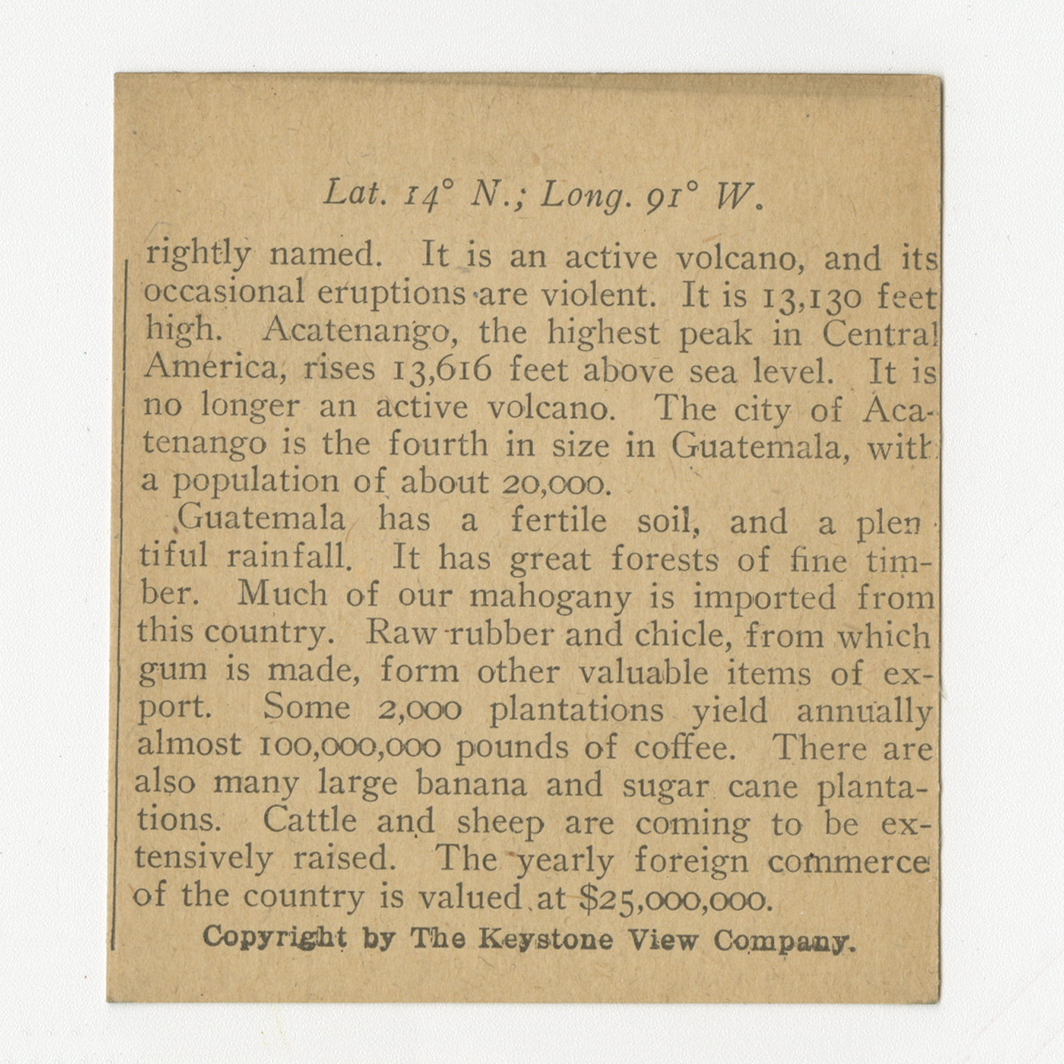 rightly names. It is an active volcano, and its occasional eruptions are violent. It is 13,130 feet high. Acatenango, the highest peak in Central America, rises 13,616 feet above sea level. It is no longer an active volcano. The city of Acatenango is the fourth in size in Guatemala, with a population of about 20,000. Guatemala has a fertile soil, and a plentiful rainfall. It has great forests of fine timber. Much of our mahogany is imported from this country. Raw rubber and chicle, from which gum is made, form other valuable items of export. Some 2,000 plantations yield annually almost 100,000,000 pounds of coffee. There are also many large banana and sugar cane plantations. Cattle and sheep are coming to be extensively raised. The yearly foreign commerce of the country is valued at $25,000,000.