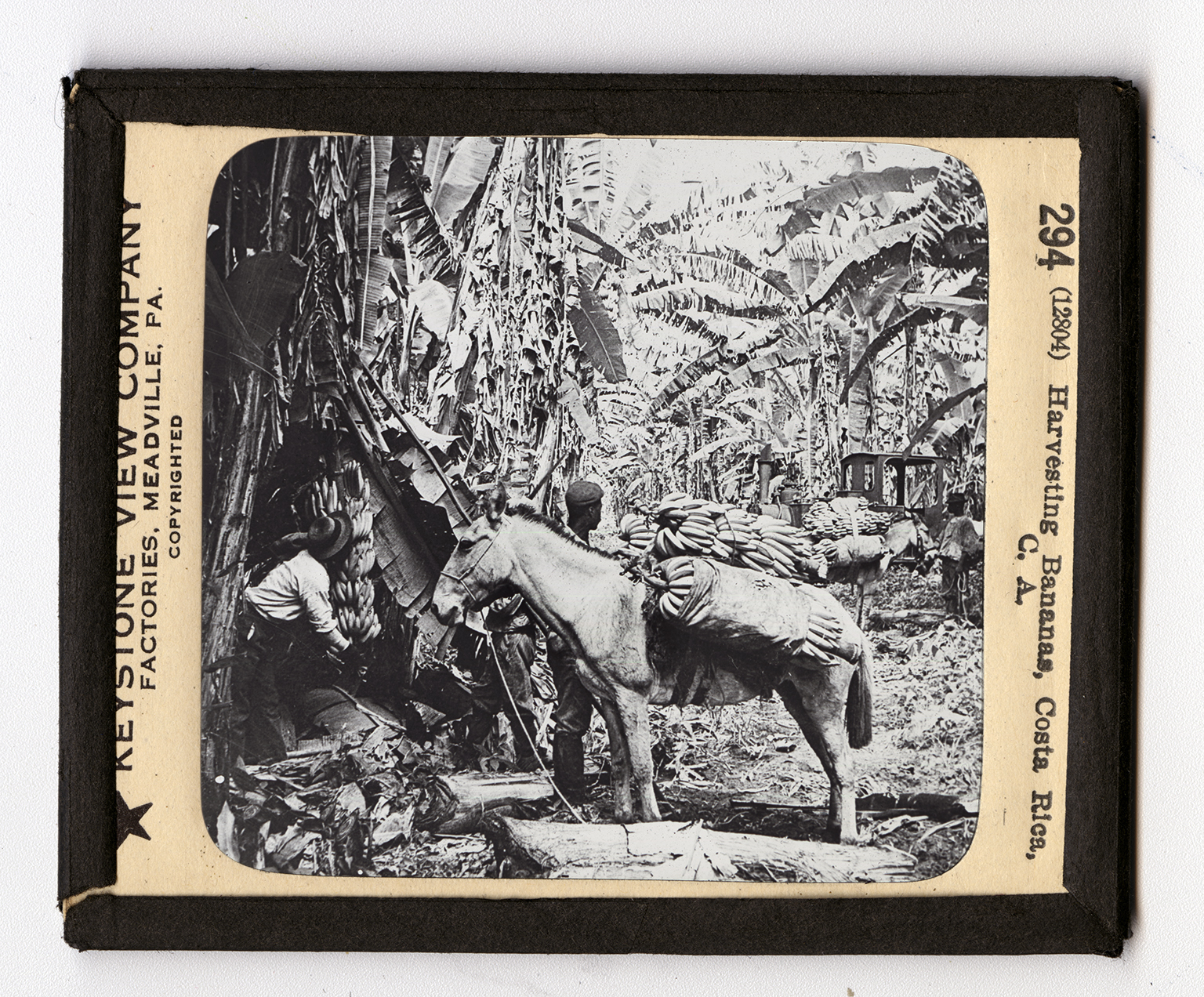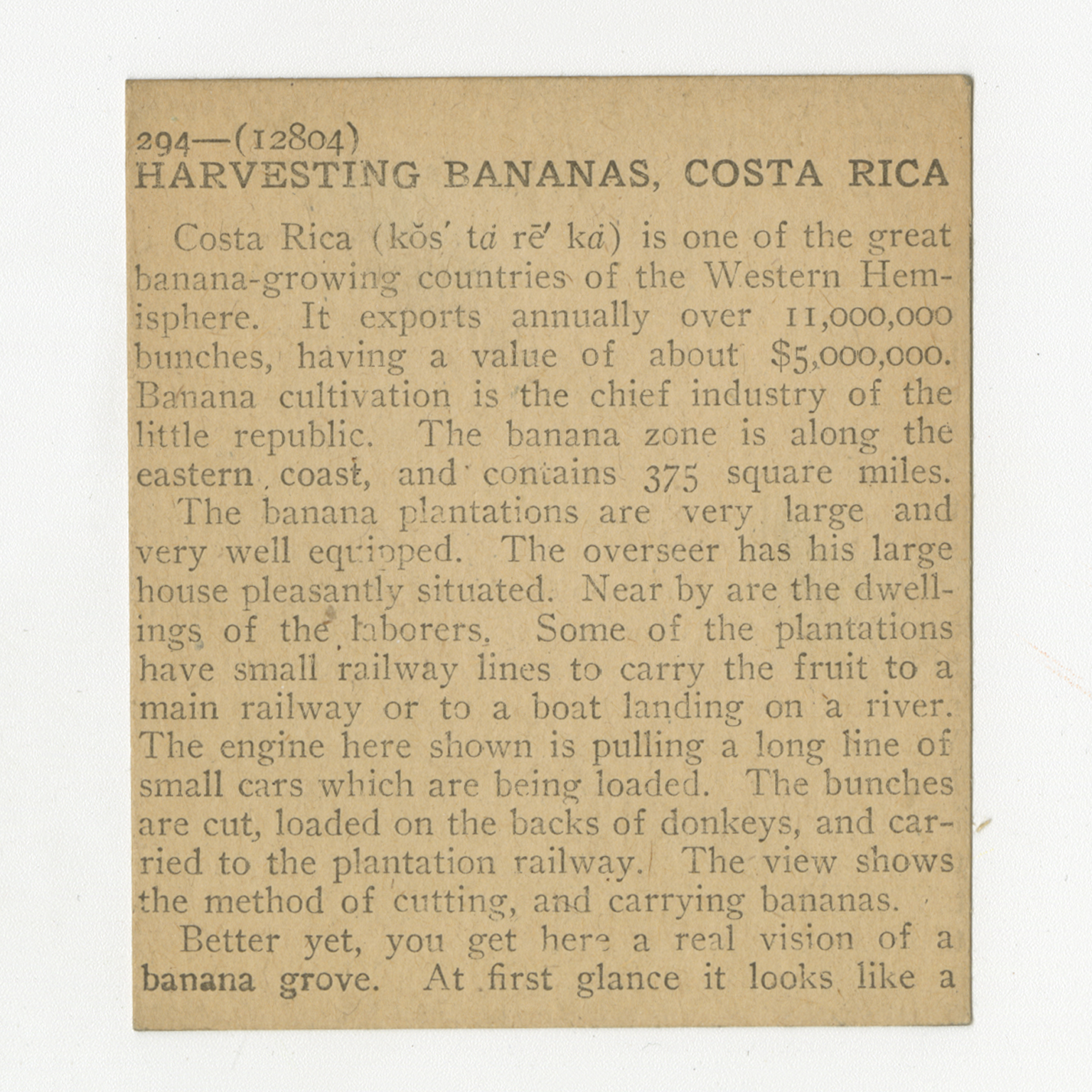 Costa Rica is one of the great banana-growing countries of the Western Hemisphere. It exports annually over 11,000,000 bunches, having a value of about $5,000,000. Banana cultivation is the chief industry of the little republic. The banana zone is along the eastern coast, and contains 375 square miles. The banana plantations are very large and very well equipped. The overseer has his large house pleasantly situated. Near by are the dwellings of the laborers. Some of the plantations have small railway lines to carry the fruit to a main railway lines to carry the fruit to a main railway or to a boat landing on a river. The engine here shown is pulling a long line of small cars which are being loaded. The bunches are cut, loaded on the backs of donkeys, and carried to the plantation railway. The view shows the method of cutting, and carrying bananas. Better yet, you get here a real vision of a banana grove. At first glance it looks like a