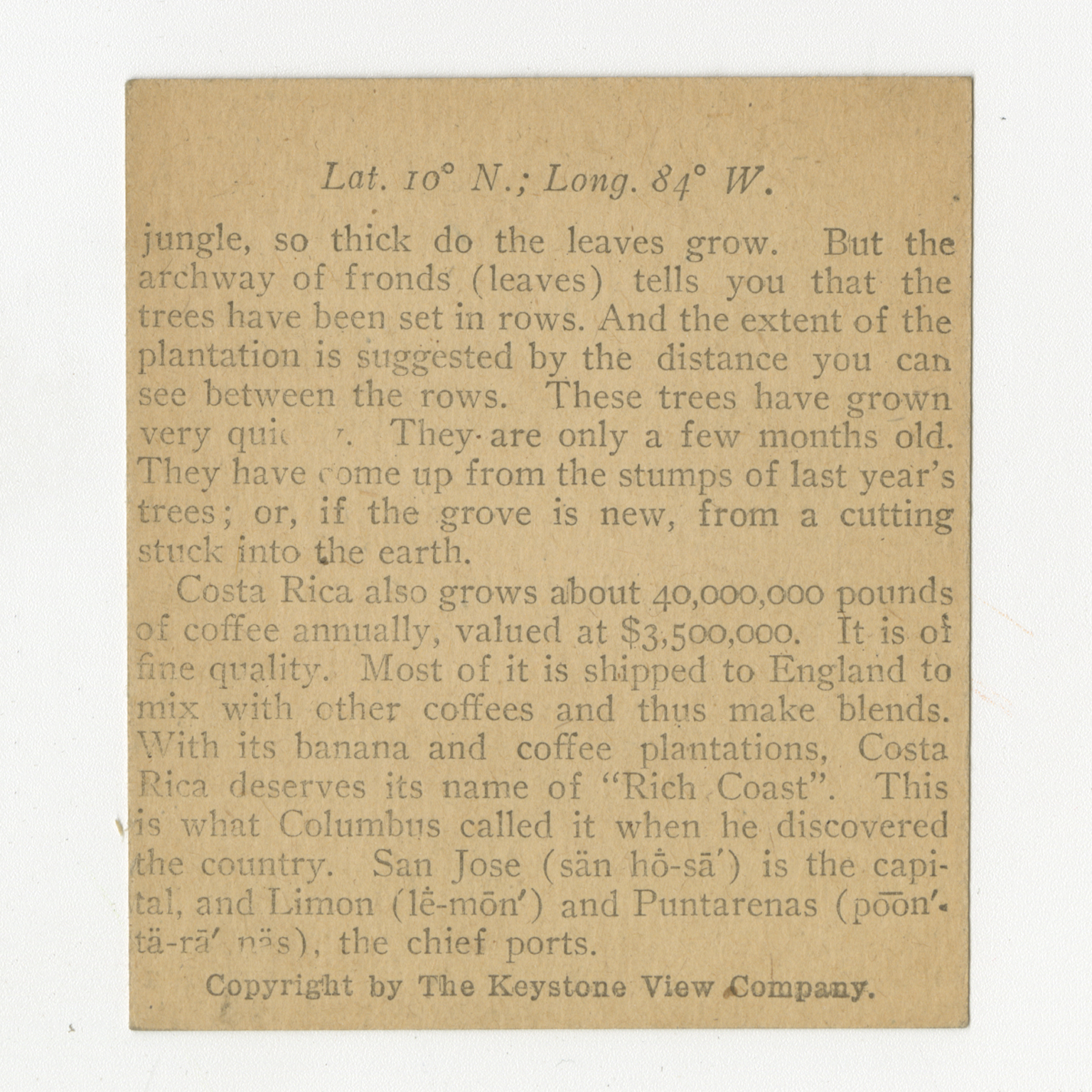 jungle, so thick do the leaves grow. But the archway of fronds (leaves) tells you that the trees have been set in rows. And the extent of the plantation is suggested by the distance you can see between the rows. These trees have grown very quickly. They are only a few months old. They havecome up from the stumps of last year's trees; or, if the grove is new, from a cutting stuck into the earth. Costa Rica also grows about 40,000,000 pounds of coffee annually, valued at $3,500,000. It is of fine quality. Most of it is shipped to England to mix with other coffees and thus make blends. With its banana and coffee plantations, Costa Rica deserves its name of "Rich Coast:. This is what Columbus called it when he discovered the country. San Jose is the capital, and Limon and Puntarenas, the chief ports.