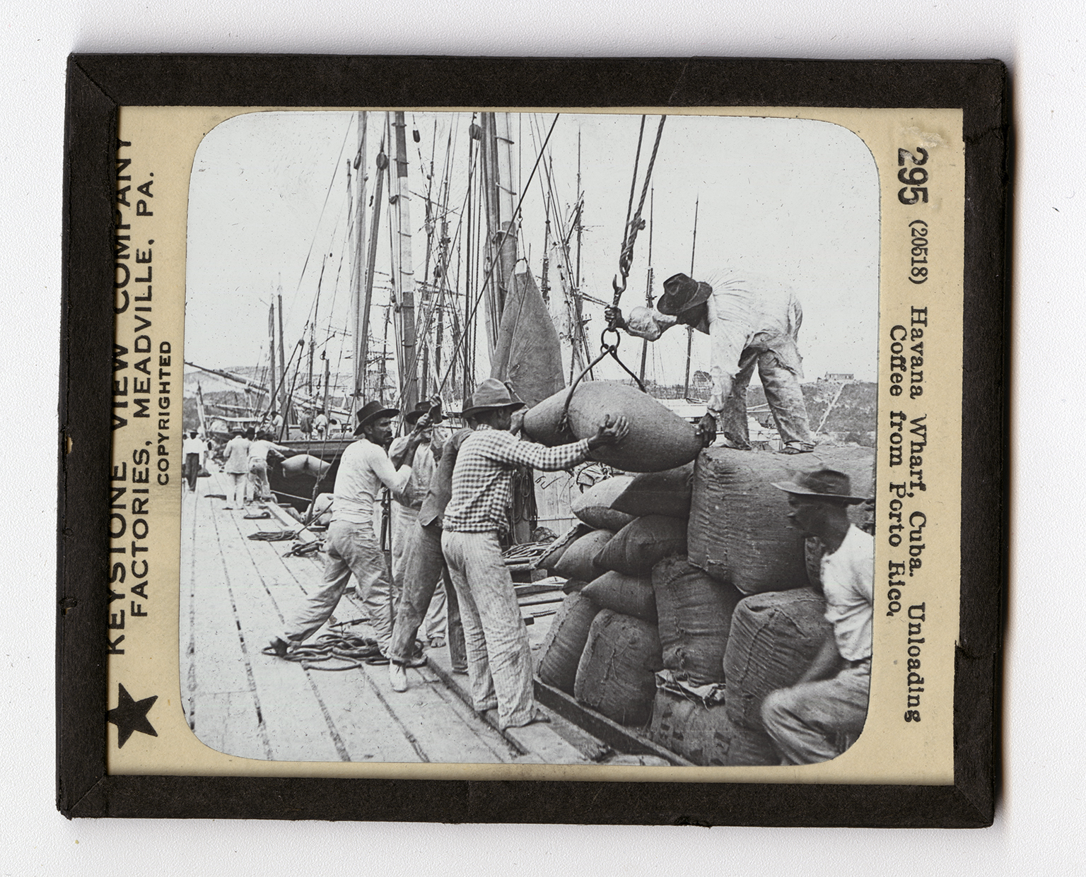 Havana is the capital of Cuba, its chief city, and the commercial center of the West Indies. Its steamship lines connect it with the ports of Mexico, Great Britain, France, Spain, Germany, and the United States. This makes the city a great exchange center for goods to be shipped from the West Indies. Sailing vessels and small steamers bring cargoes of coffee and sugar from Porto Rico to Havan. Here they are unloaded on the wharves and loaded on ocean liners bound for foreign ports. The United States received from Porto Rico over 500,000 pounds of coffee in 1916. The view shows the way in which sacks of coffee are unloaded from the small Porto Rican sailing vessels on the wharf. Each of these sacks contains 132 pounds of green coffee. Green or raw coffee is coffe that has been dried, but has not been roasted. The sacks are too heavy for
