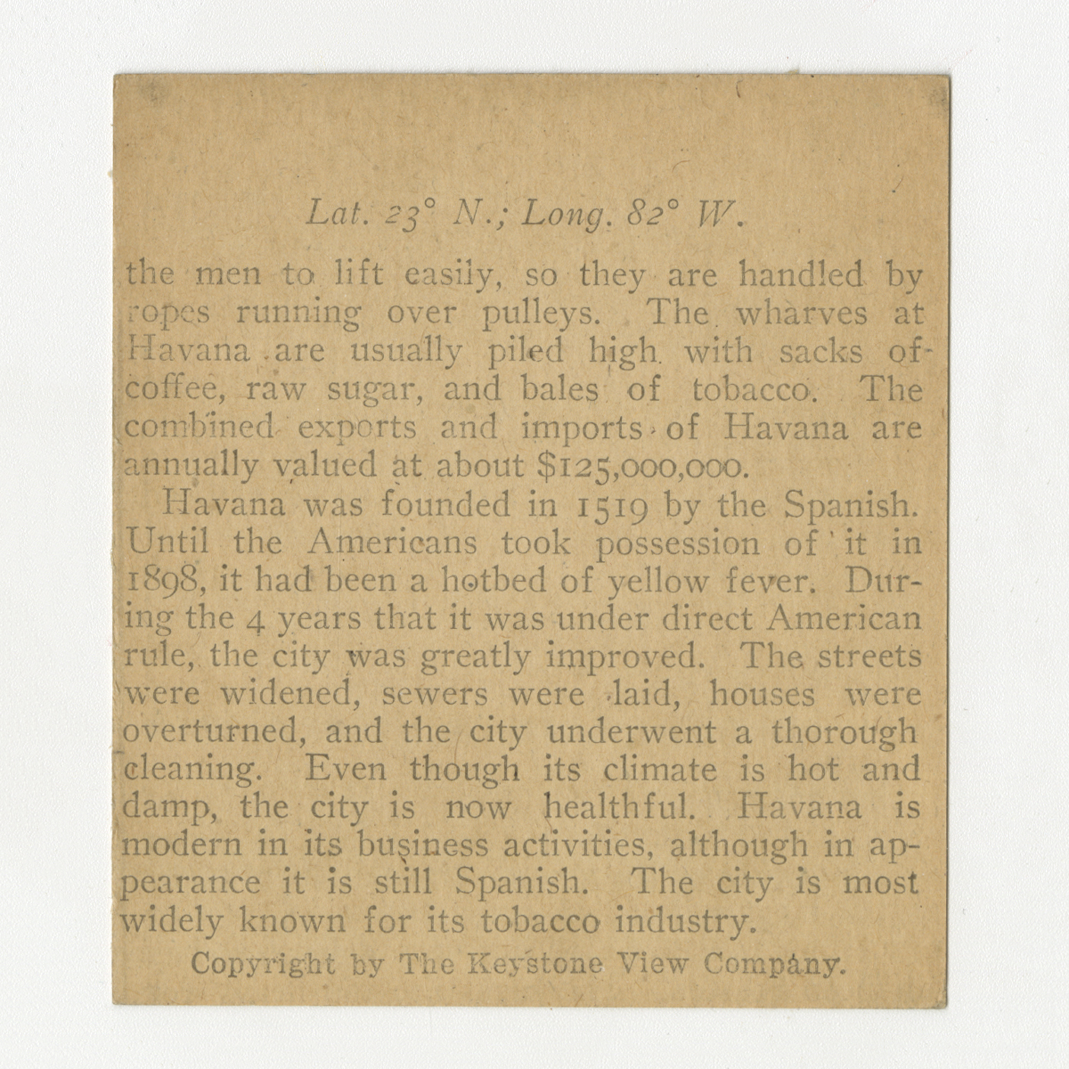 the men to lift easily, so they are handled by ropes running over pulleys. The wharves at Havana are usually piled high with sacks of coffee, raw sugar, and bales of tobacco. The combined exports and imports of Havana are annually valued at about $125,000,000. Havana was founded in 1519 by the Spanish. Until the Americans took possession of it in 1898, it had been a hotbed of yellow fever. During the 4 years that it was under direct American rule, the city was greatly improved. The streets were widened, sewers were laid, houses were overturned, and the city underwent a thorough cleaning. Even though its climate is hot and damp, the city is now healthful. Havana is modern in its business activities, although in appearance it is still Spanish. The city is most widely known for its tobacco industry.