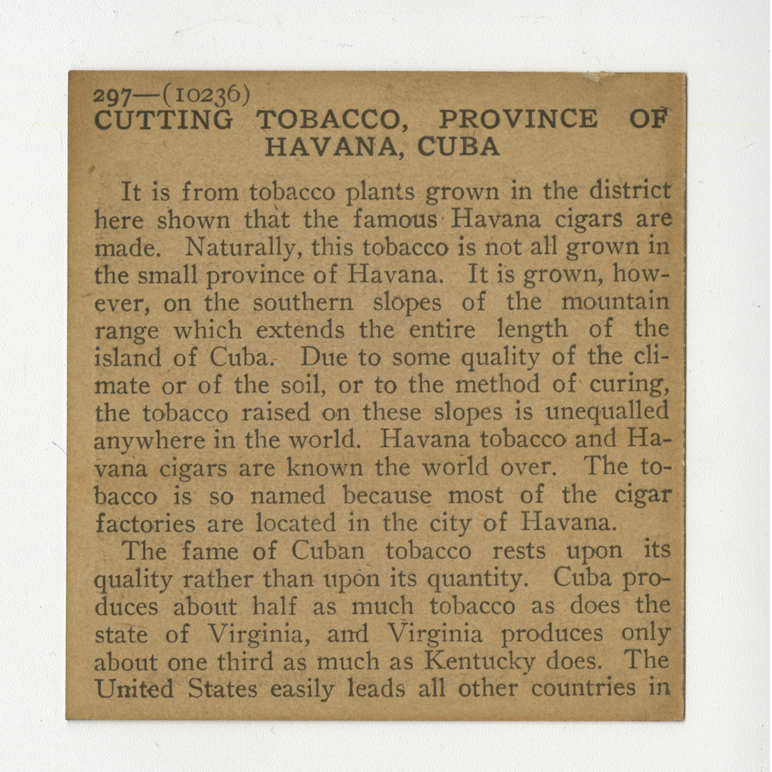 It is from tobacco plants grown in the district here shown that the famous Havana cigars are made. Naturally, this tobacco is not all grown in the small province of Havana. It is grown, however, on the southern slopes of the mountain range which extends the entire lenght of the island of Cuba. Due to some quality of the climate or of the soil, or to the method of curing, the tobacco raised on these slopes is unequalled anywhere in the world. Havana tobacco and Havana cigars are known the world over. The tobacco is so named because most of the cigar factories are located in the city of Havana. The fame of Cuban tobacco rests upon its quality rather than upon its quantity. Cuba produces about half as much tobacco as does the state of Virginia, and Virginia produces only about one third as much as Kentucky does. The United States easily leads all other countries in